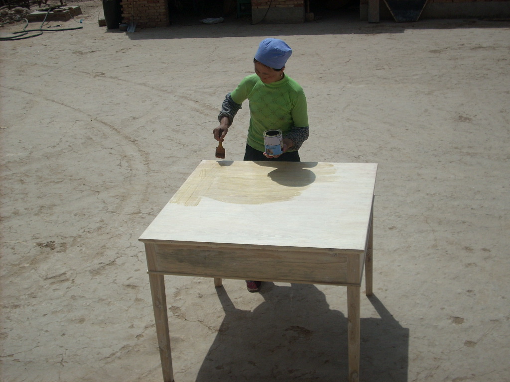 你看,一张八仙桌在森工师傅的努力下已经基本做好了,不过一件成形的家具要经过很多道工序,这些工序当中最重要的就是打磨,每一件家具经过粗细不同的砂纸三四次打磨以后才行,打完一后用手摸起来特别光滑,这时说明已经打磨成功了,可以开始漆漆了。