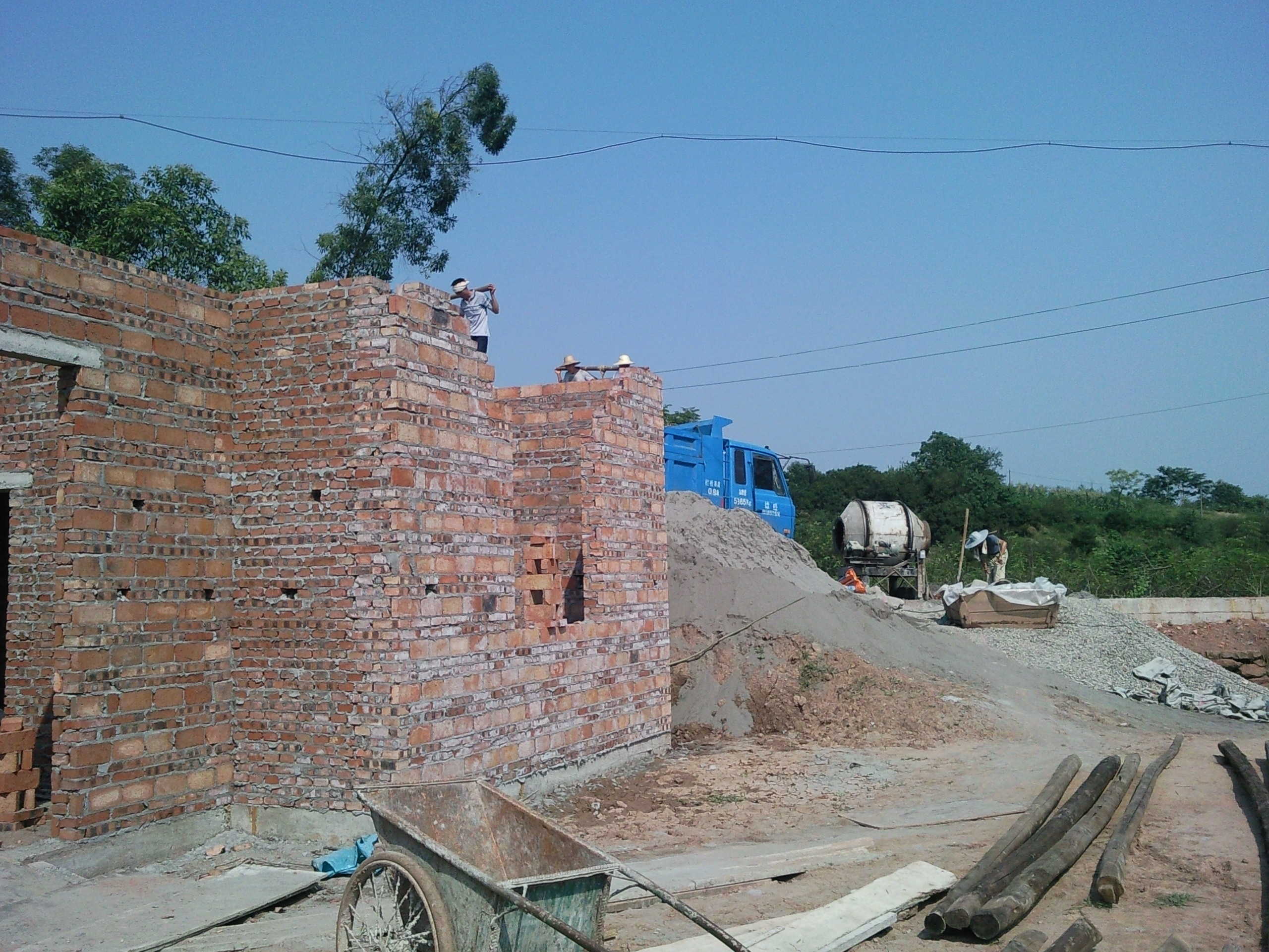 这是我的大哥和二哥他们几个在往楼上抬水泥和砖,烈日炎炎,尽管他们已经汗流浃背,但是他们还是没有放下肩上的担子,给我们家辛苦的忙碌着。