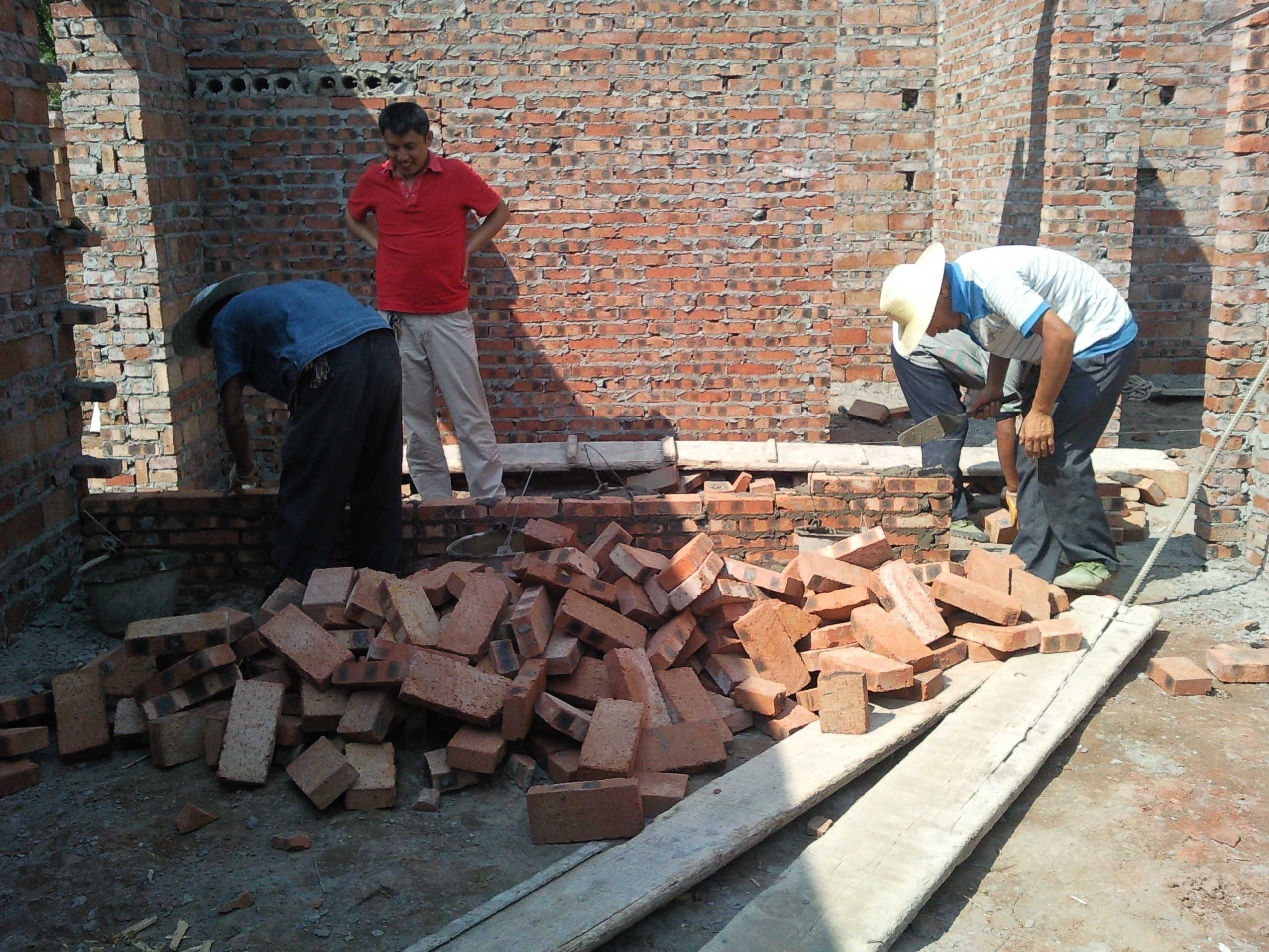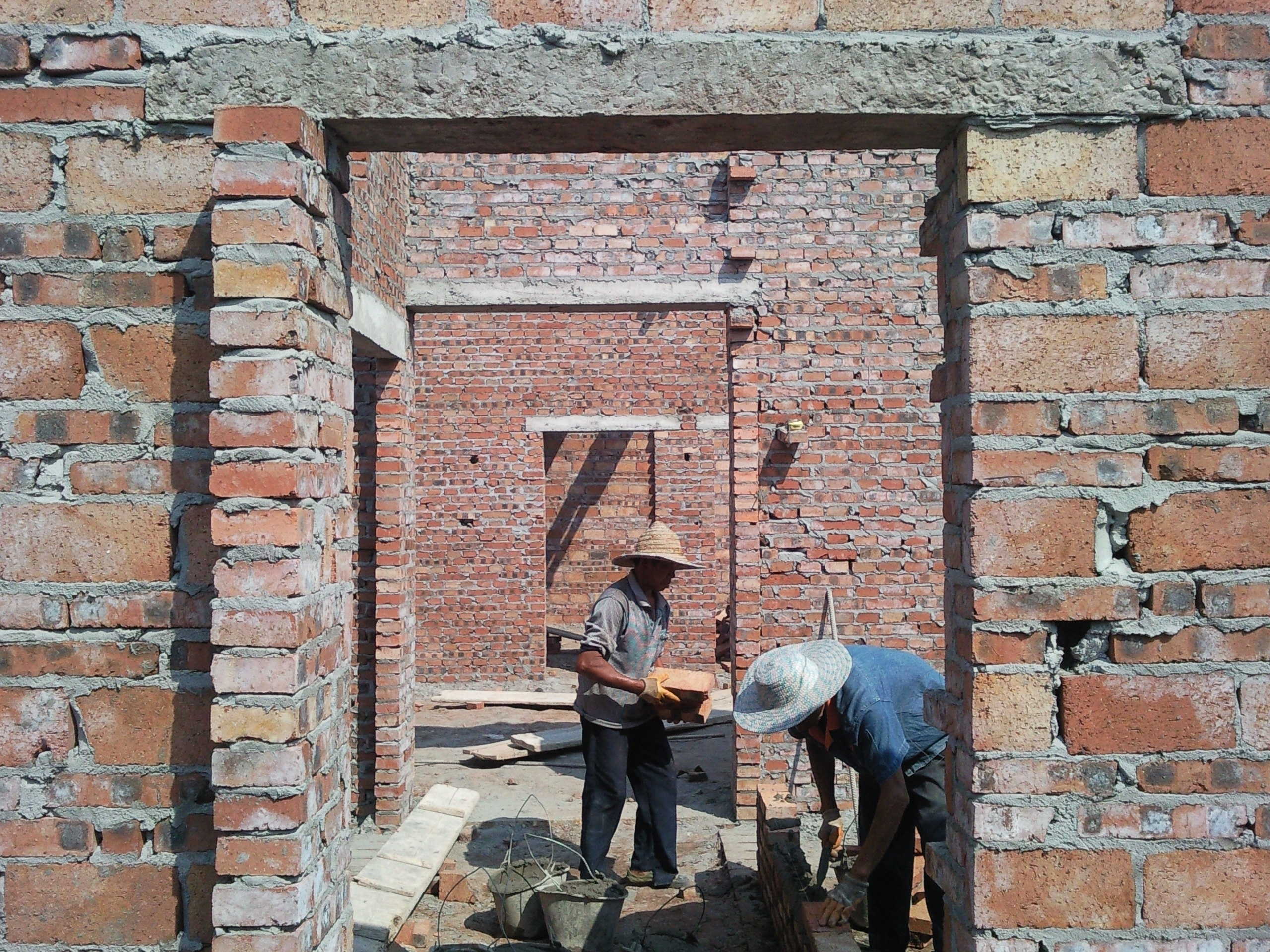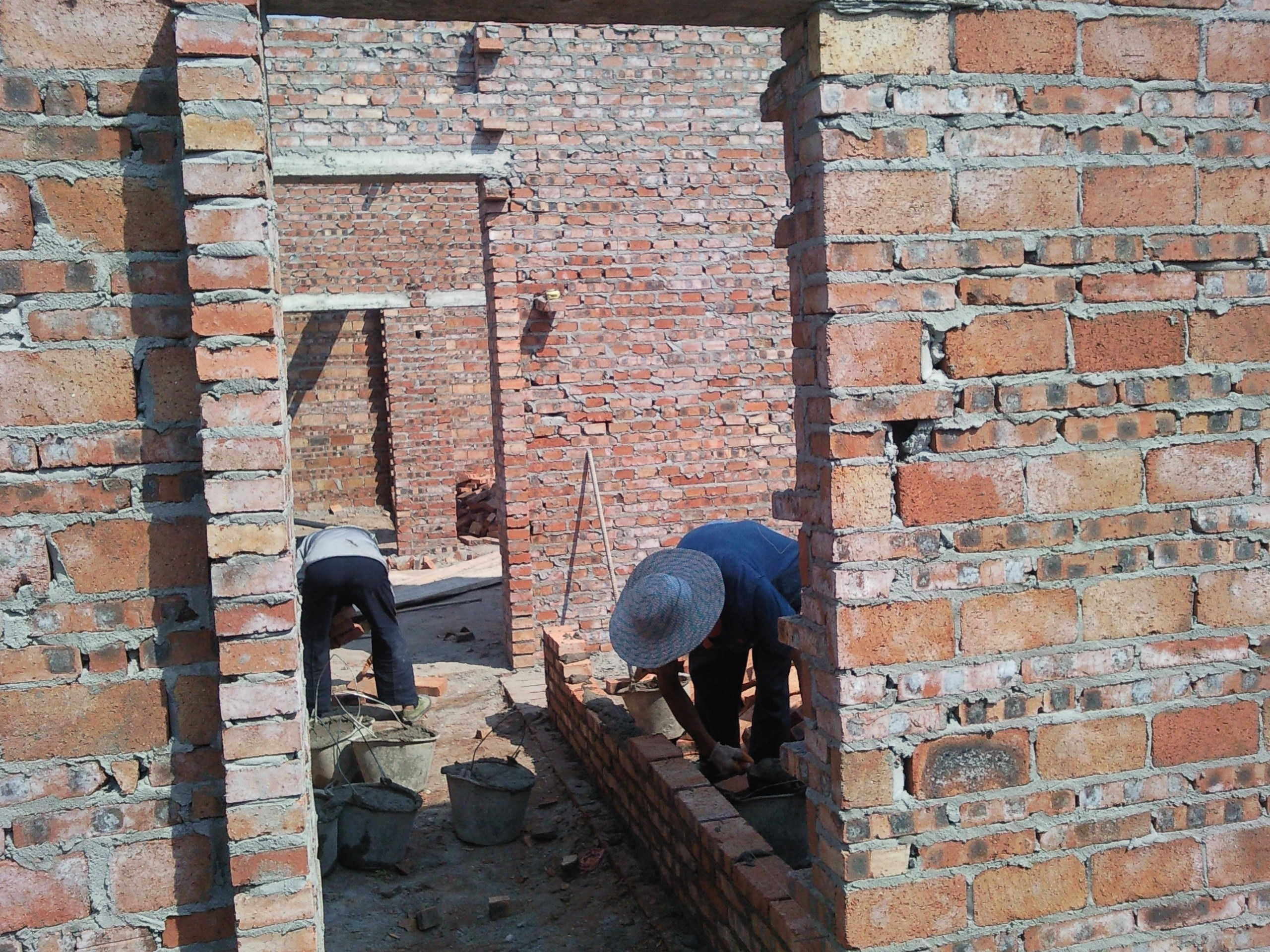 给我们家帮忙的都是亲戚,这是我二叔和大伯在砌墙,他们把砖用和好的水泥一块一块的叠起来,每拿一块砖他们就要弯一次腰,砌一面墙他们要弯多少次腰,拿多少块砖啊,我的亲人们!