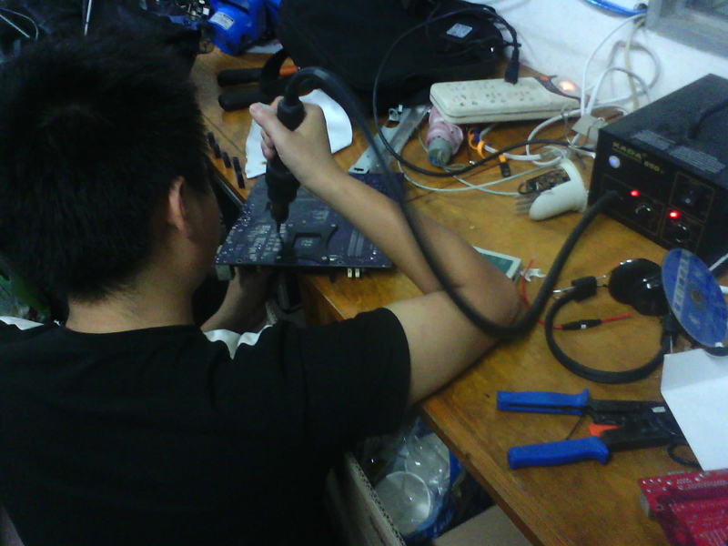 师父终于拿出了他的秘密武器——风枪,听师父说这是专门用于取一些难取的电容,听着风枪隆隆的声音,可以看见电容上面的焊锡融化了,就可以取出电容了。