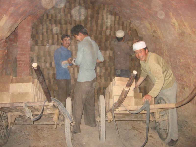 然后把晾干的坯子用板车拉入窑中,摆成极有规则的行状,必须把窑摆满,以防倒塌。