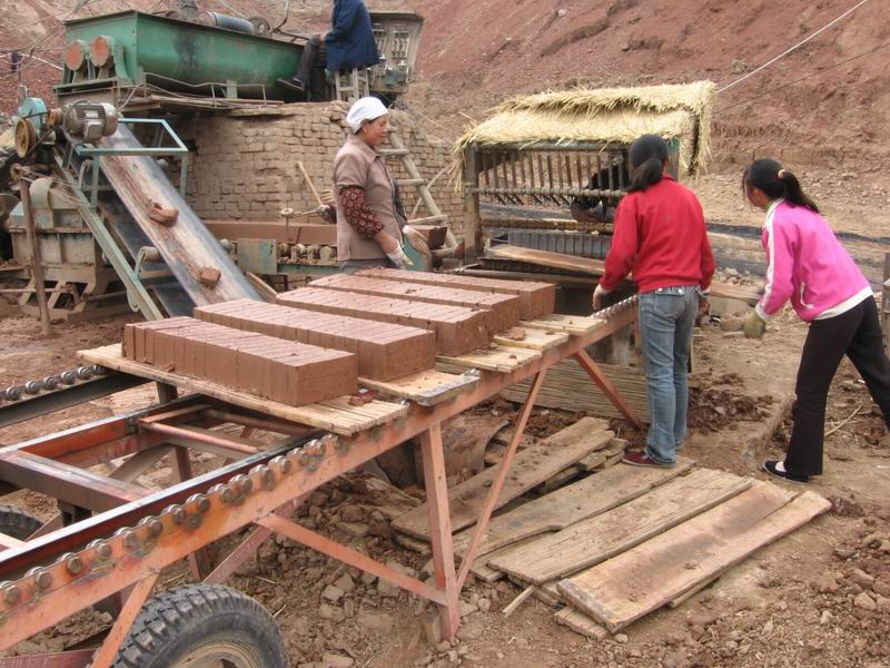 用泥做坯子时,把泥灌入机器。他的里边安装着砖的模式,出来的时候已是砖的模样。再由两个人用木板接到另一头。