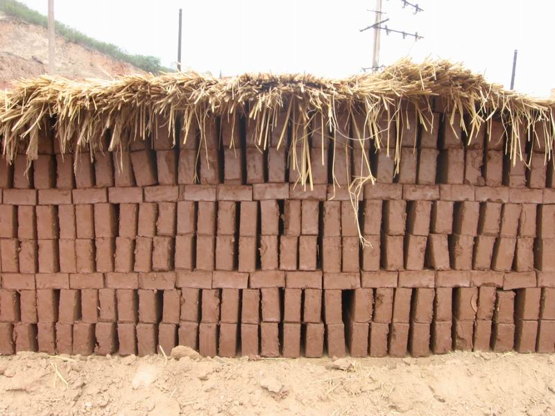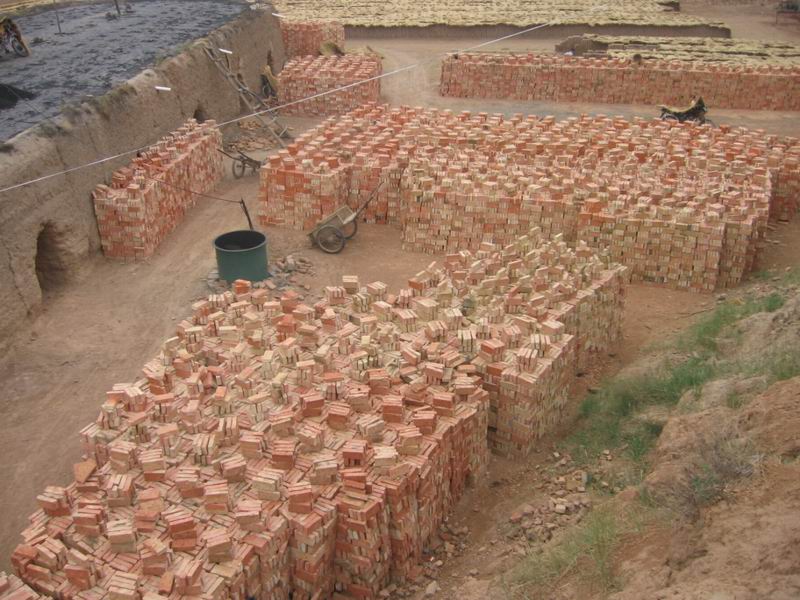 砖坯子出机了,然后把它们垒起来,晾五到六天。因为这样烧出来的砖会更红。