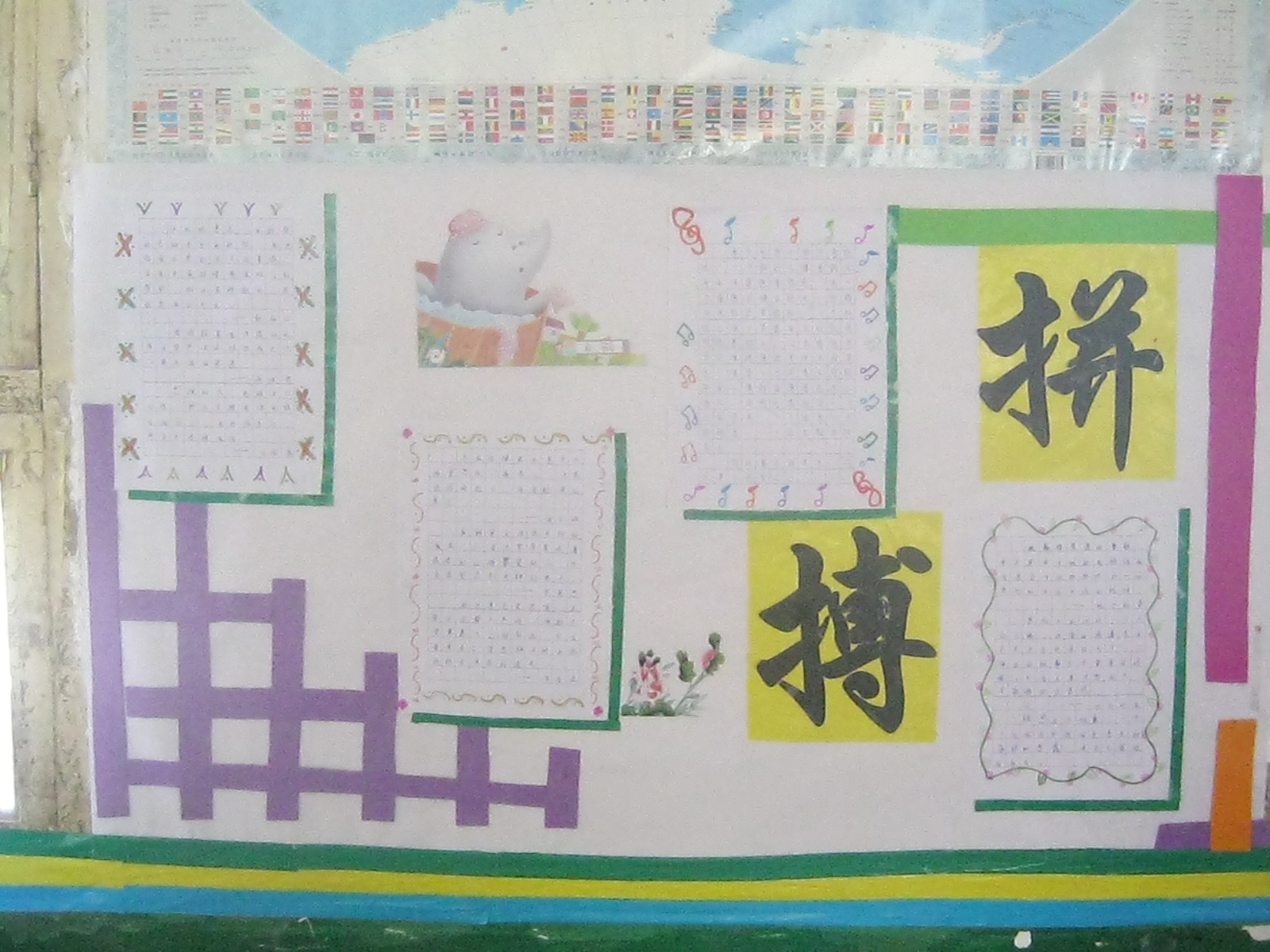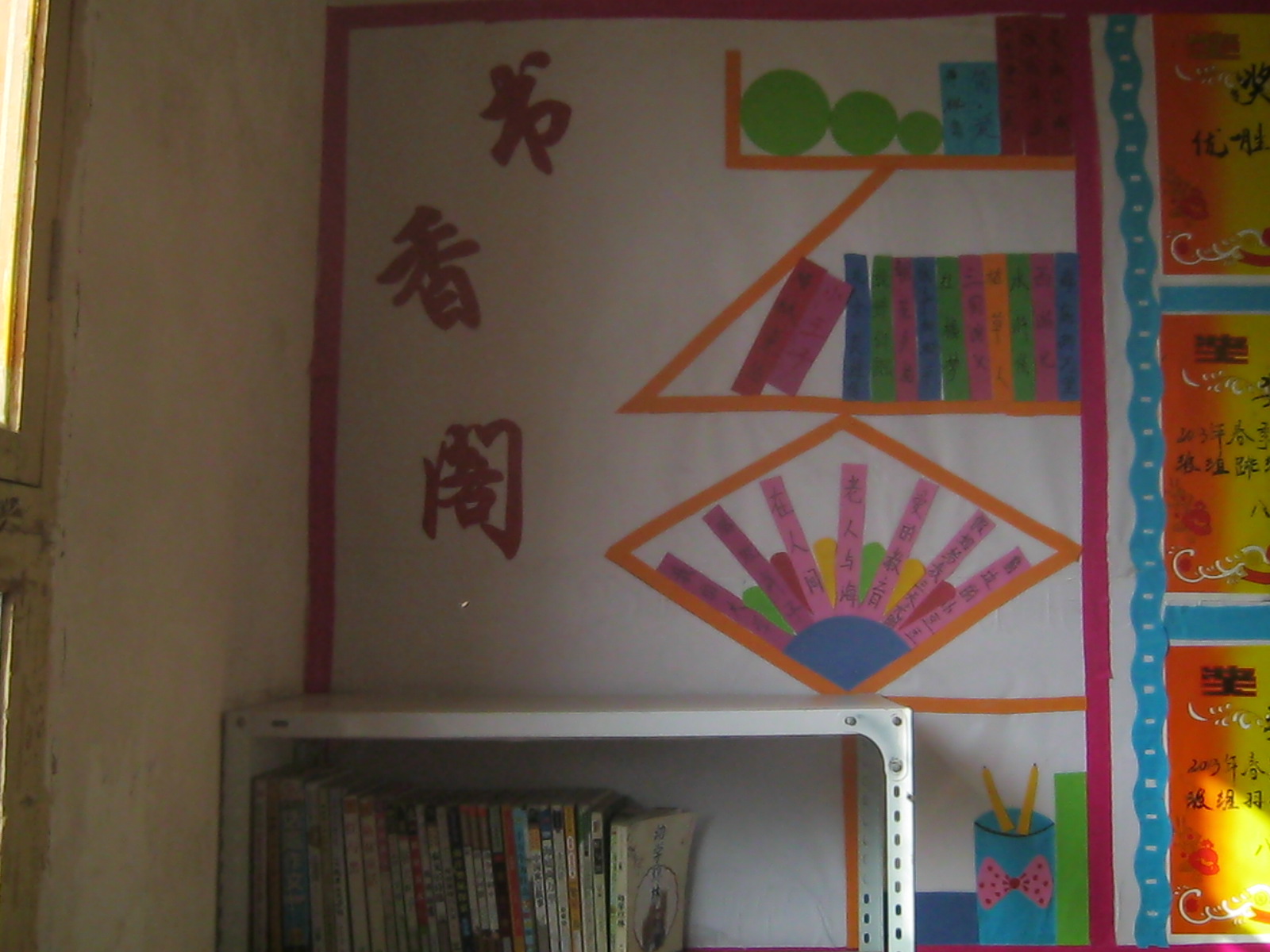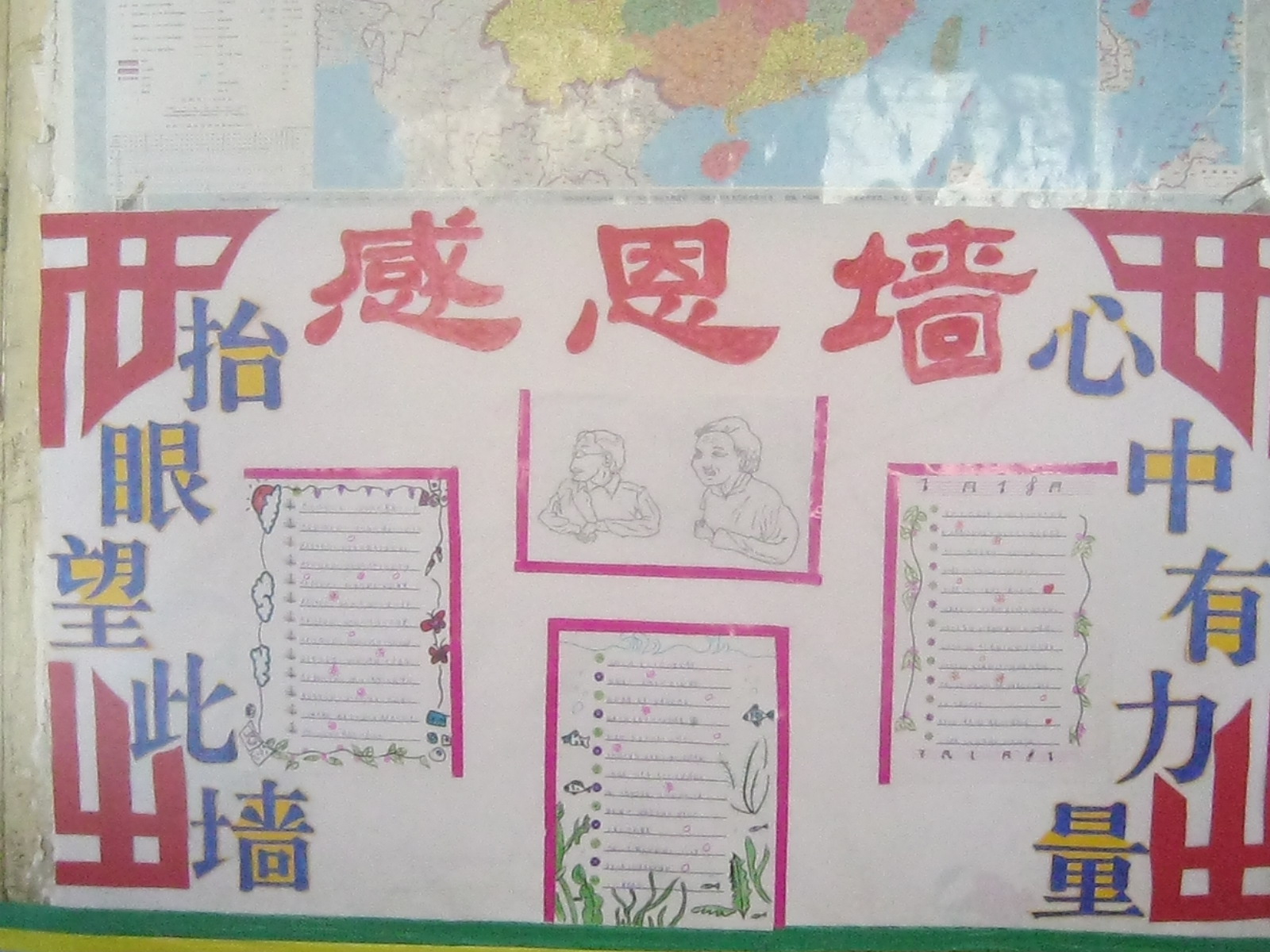 接下来要说的就是教室布置了,一共有四面墙壁。看看,花花绿绿的就是我的劳动成果,红灿灿的,还有用彩笔写在纸上的学习方法,裁成各种形状,贴在哪儿,还挺好看呢!不错吧!