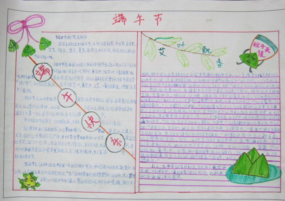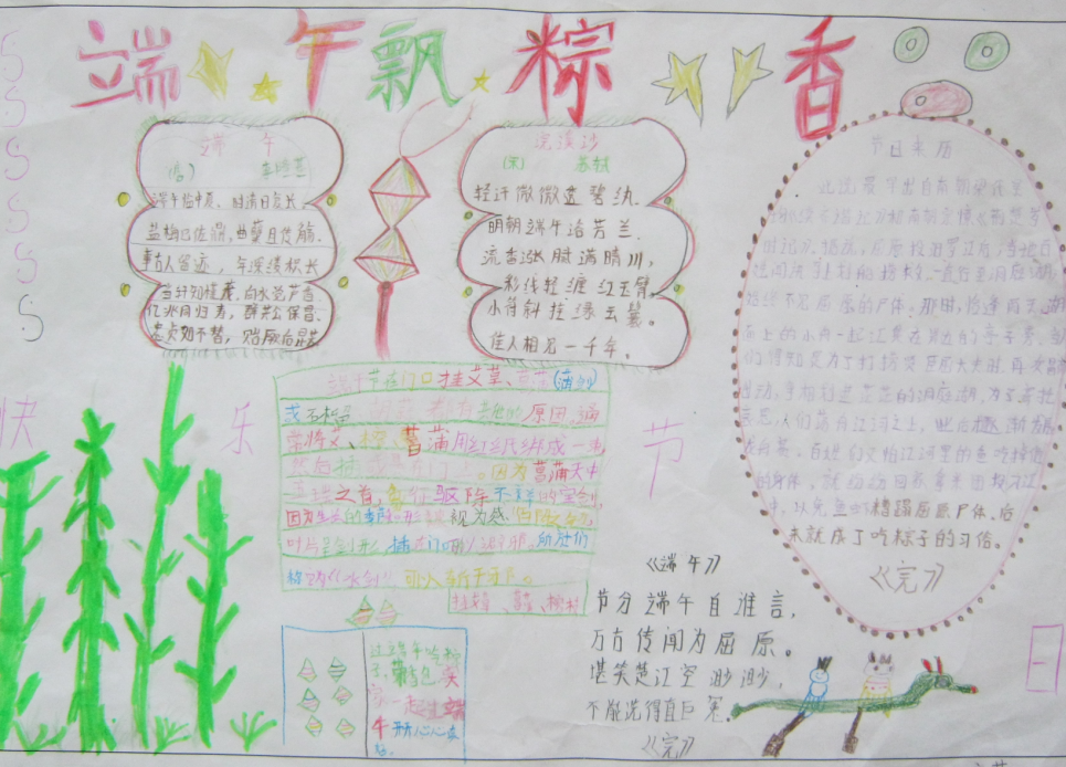 早上,爷爷给我们讲完屈原的故事后就带我们去市场买粽子,市场上买粽子的人真多啊,粽子的种类也不少,有红豆的、也有枣泥的、还有肉粽子,爷爷给我们买了各种粽子,又带我们去买荷包,五颜六色的荷包漂亮极了,各式各样的,我和弟弟挑了自己属相的荷包,还买了条手链,据说带五彩手链会驱邪的。卖完东西我们高高兴兴的跟着爷爷回家了。