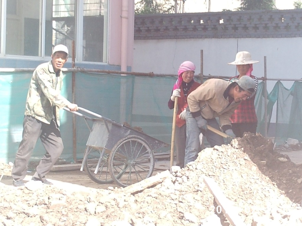 再看,私人家里的工人们早早起床,扛水泥,运沙石,担水……一切准备就绪了,人们才开始拌水泥,用铁锹一锹一锹地翻,在一桶一桶往水泥堆上到水……,要费很大的力气才将沙浆拌好,还要一砖一瓦砌房子,一天过去才完成机器工作的三分之一不到。这简直就是一个天上,一个地下。