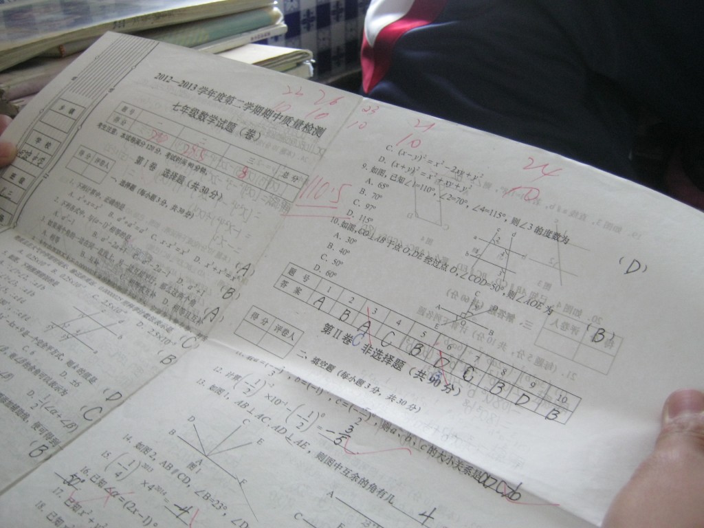 “叮铃铃”上课了,老师拿着试卷走了进来,这时,我的心里很不安,为什么呢?因为我怕他考不好。试卷很快发下来,一看题,我的嘴巴成了“o”形,一定能塞下一个鸡蛋—试卷上的题也太难了。我回过头去看看他,他正在认真的做题,他的卷子上打了红红的112.5分。
