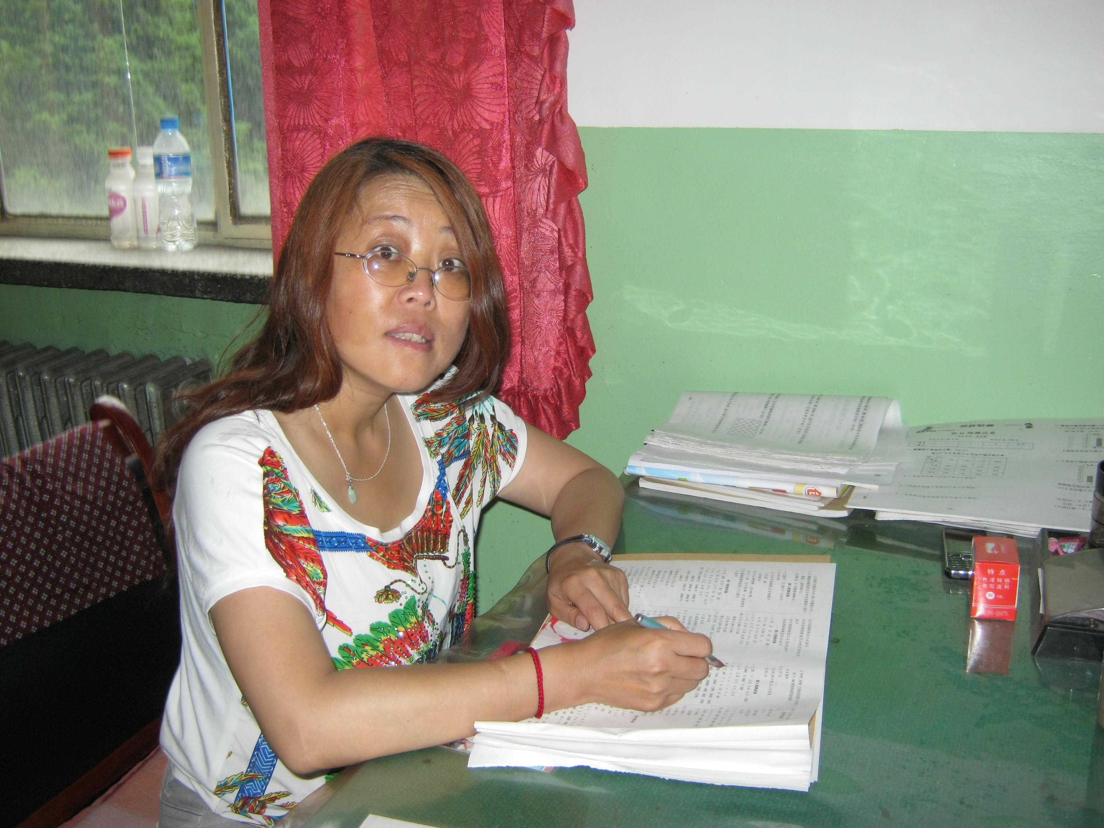 我的数学老师她姓李,中等个,很苗条,她弯弯的眉毛,戴着眼镜,长长的头发,卷卷的披在肩上。