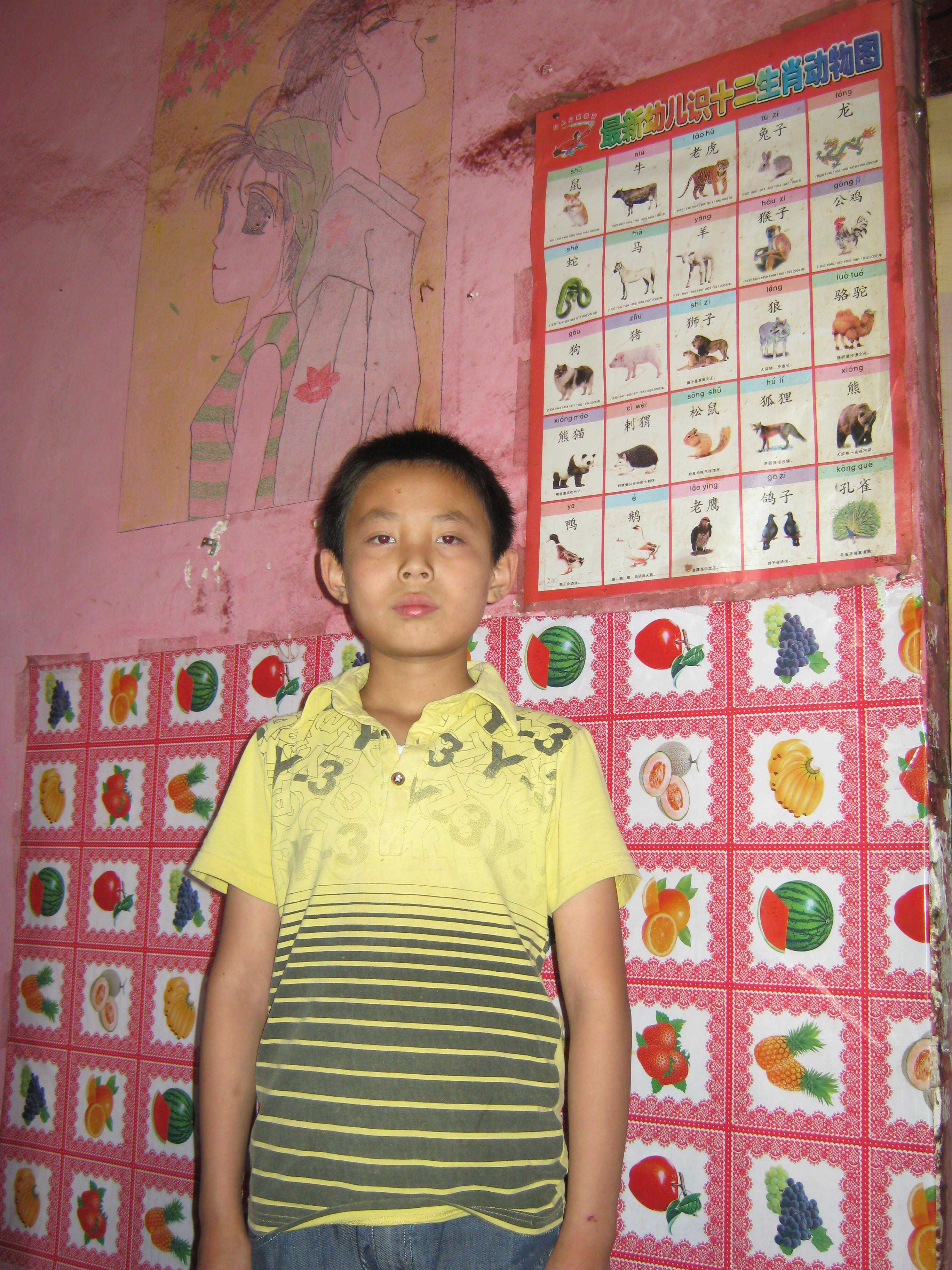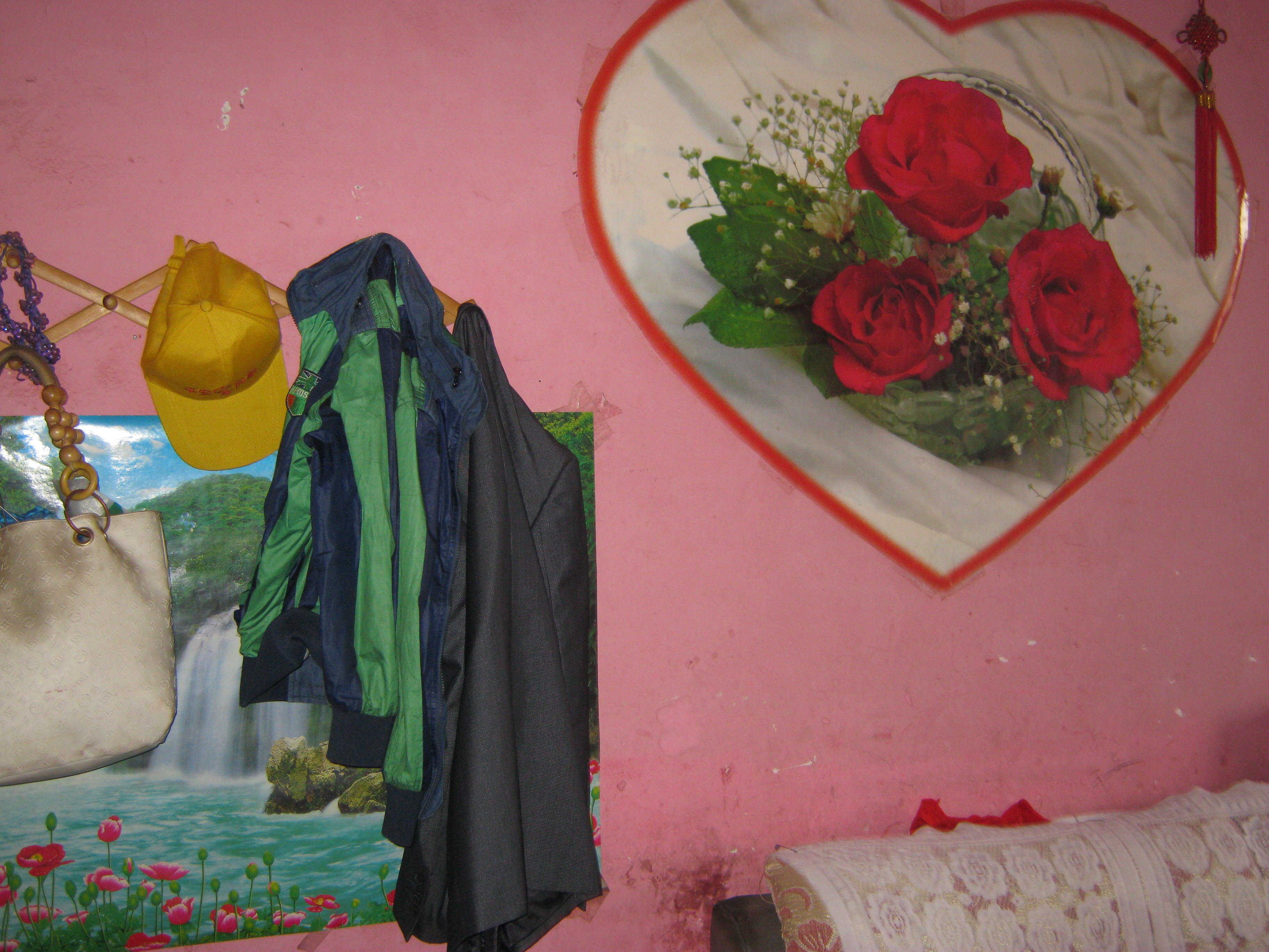 此时,我们也看到了李志洋的爸爸正在楼门口等我们,他热情地招呼我们上楼。这进得楼来,跟外面可真是两个世界,虽然楼梯很宽阔,楼道也比较宽,但是非常昏暗,楼梯台阶也有破损,墙壁更是看不到它的本色。伴随着我们脚步的回声,我们来到了四楼李志洋家。由于楼道太昏暗,我根本没有看清楚他家的门牌号,只是在李志洋爸爸推开一扇木门后我们就走了进去。这二十平方左右的房子里一张双人大床占去了多半的空间,另外还有沙发、茶几、衣柜、电视柜,实在是拥挤。不过李志洋的妈妈把这里打理得倒是非常的干净整洁。粉色的墙壁上有一副他们亲手绘制的很有浪漫情调的画,小窗户边上养着一盆翠绿欲滴的仙人掌,这真是一个温馨的,富有生活情调的家。