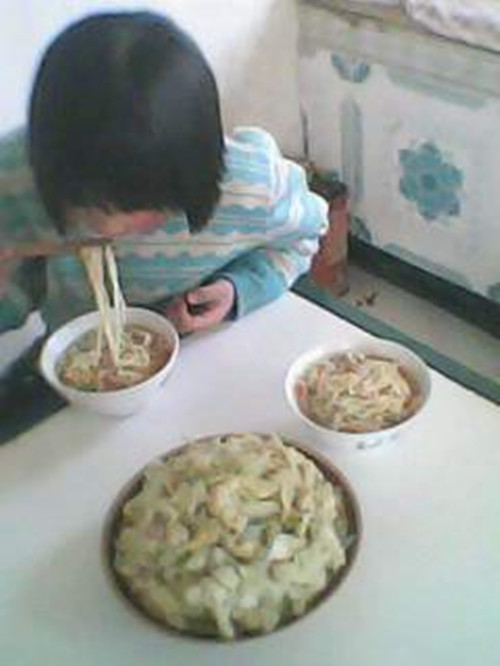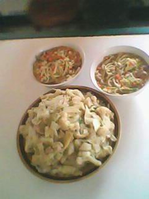 妈妈先把面粉和成较硬的面团(如果太软的话面是擀不开的),然后用擀杖把面团擀成一片薄薄的圆饼,接着就要用刀切成细细的面条。这样面条就算做好了,接下来就是做臊子汤。
