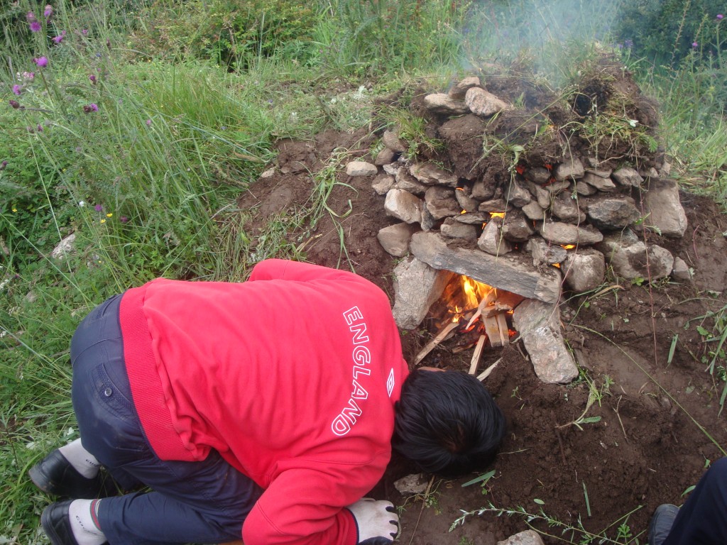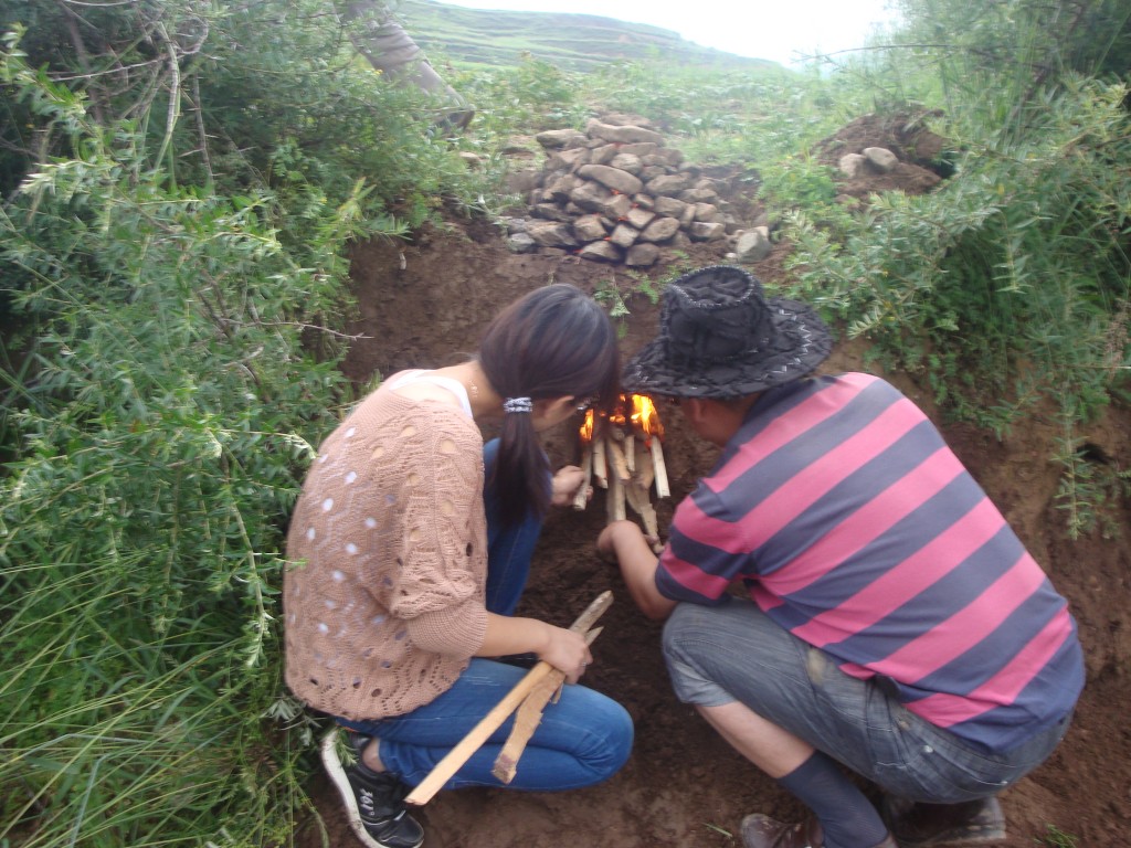 我们兴高采烈地开始挖了,不一会儿就基本挖好了,只剩下灶坑和烟道的连通问题了。铁锨太大,伸不进去,我想了想,拿根棍子对准烟道,再拿块石头一敲,嘿!还真就通了。正在这时,去拣柴火的小伙伴也满载而归了。我们一起把土块砸的像核桃一样大,再把砸好的土块垒在挖在上面的那个灶坑上。我们边垒土块边往中间收缩,越往上垒圈就越小,小的像老鼠洞。眼看就要成功了,一不小心,垒好的土块全塌了。我暗想:这才是技术活呢。