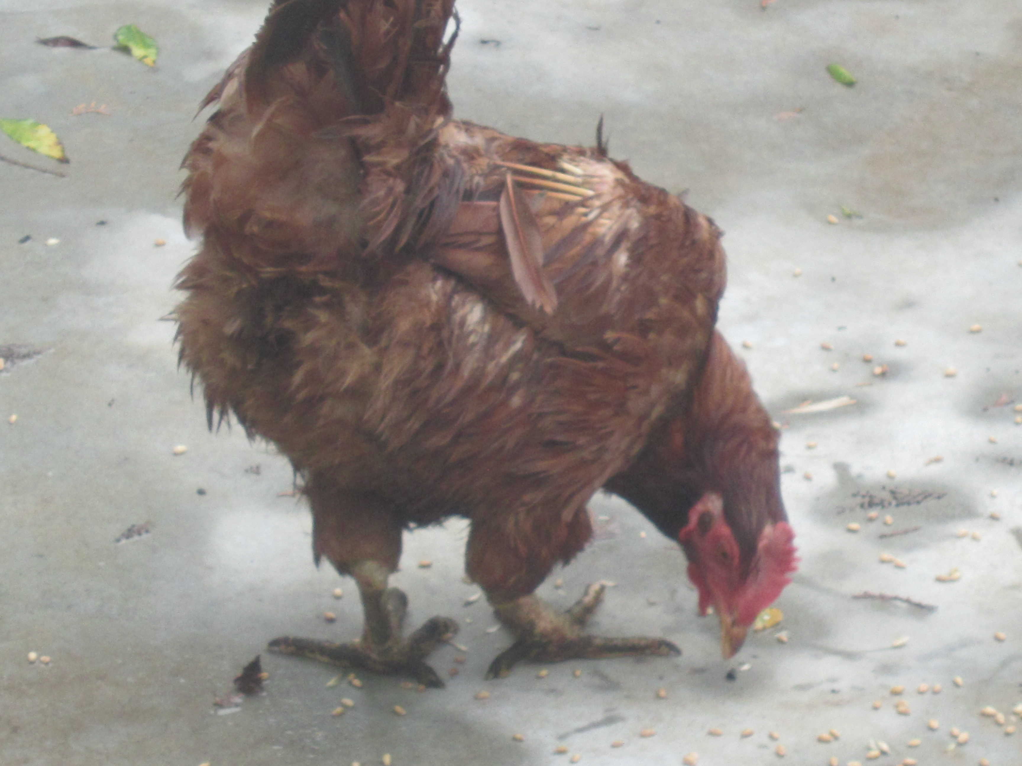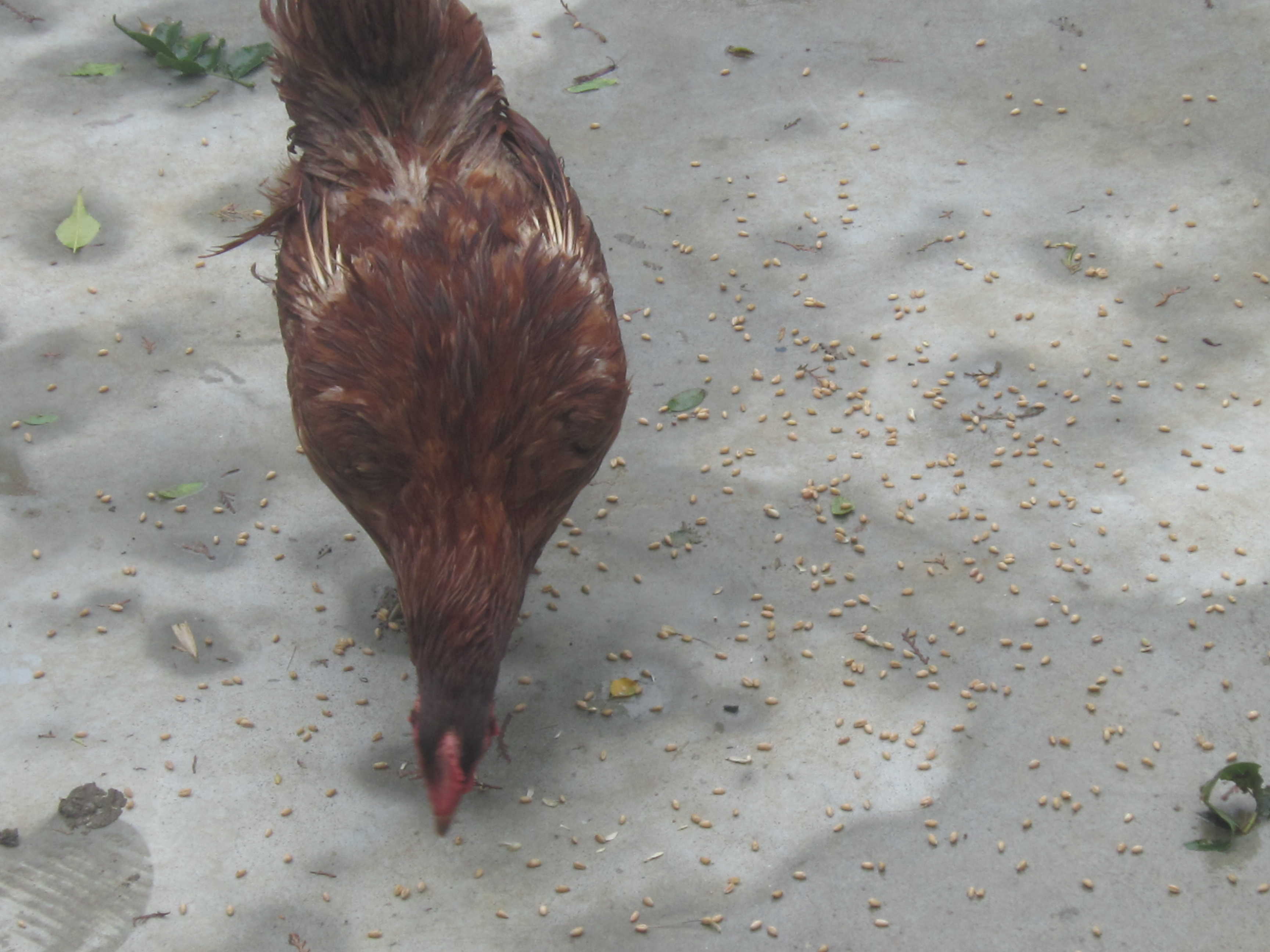 这只鸡看起来瘦弱,非常孤独,每天回来吃饭,吃完就又走了,蛋也在外面下,经常夜不归宿,每天晚上母亲都会让去把鸡捉回来。鸡吃食时很可爱。