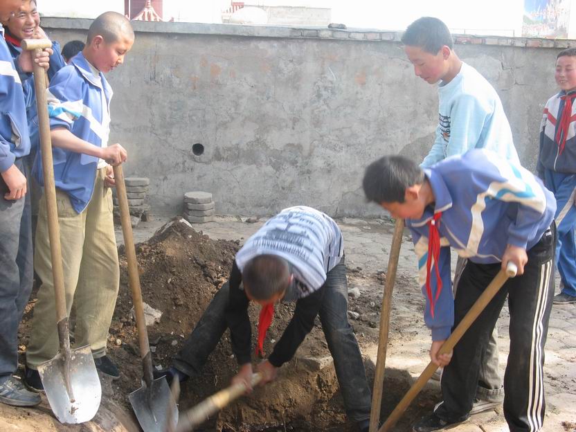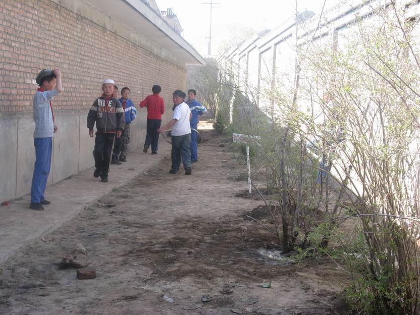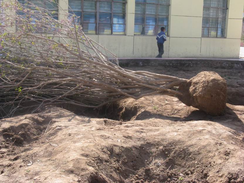 学校政务处的老师给我们规划了种树的地点,同学们先按照树苗的大小,挖了个差不多的坑,这种劳动一般都是我们班的男生完成,几个拿着镐头、铁锨同学轮番上阵,不一会儿树坑就挖好了。种树也有大学问,就像是同学们买鞋子,总要合脚才行,因此树坑的大小也要依照树苗的种类而定,如果是灌木的植物,比如说刺玫、榆叶梅等,树坑不要很深,因为灌木植物的根长得不是很深;如果是钻天杨一类的树木就要把树坑挖的深一些,然后在树坑里加一些肥料,我们在农村,肥料倒是很容易找得到。