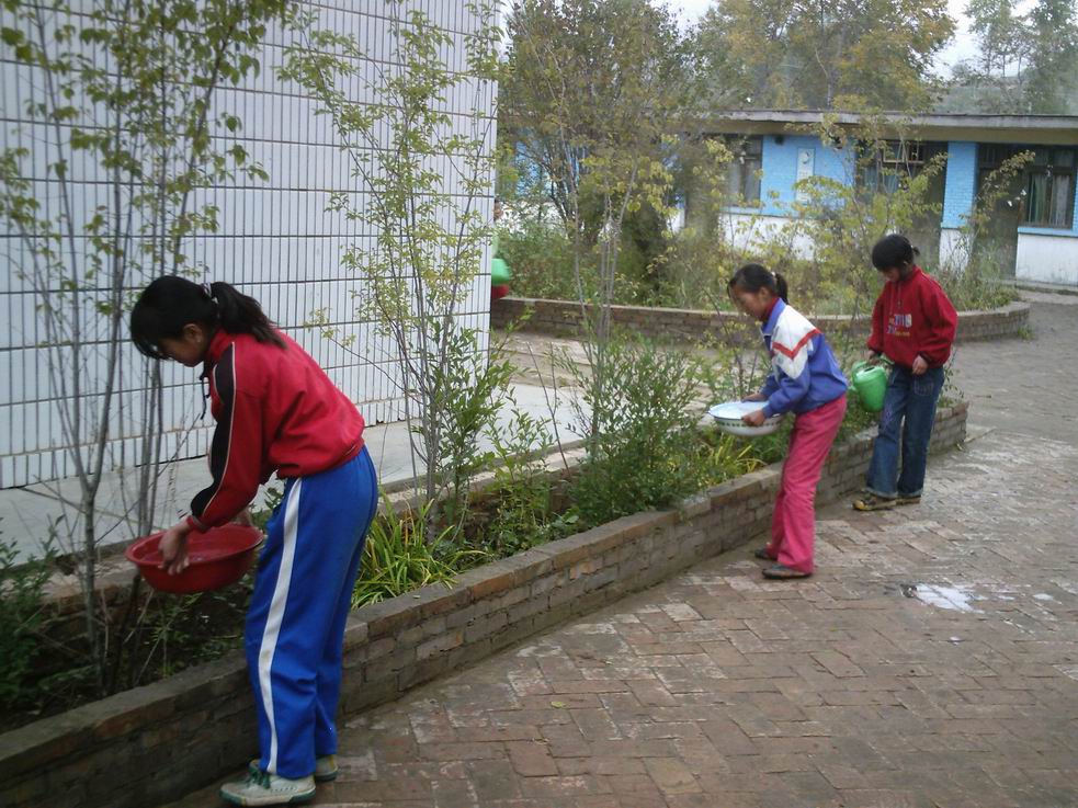 男同学把树栽好了,接下来就是女同学的任务了,她们拿着水桶、水壶、脸盆,接上清清的水,就像喂养家里的小牛一样,把每一棵树苗都浇一遍,真希望小树苗明天就能长大。