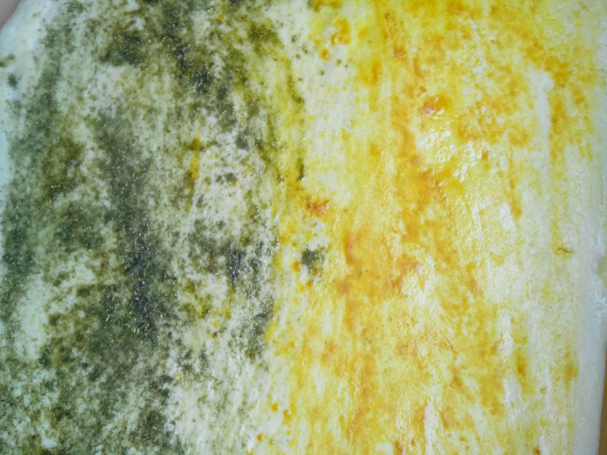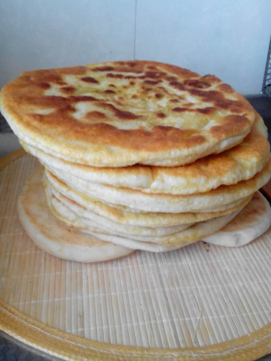 我们这里做馍馍都要放两个秘密的调料,那就是香豆和姜黄,把它们卷到面里,做出来的馍馍又好看又好吃。接着妈妈往铝锅里到了一点油,油开始冒烟的时候,妈妈把面饼放了进去,盖上了锅盖。等到面饼的一面有小泡泡鼓起来,就翻到另一面,一会一个油饼就烙好了。