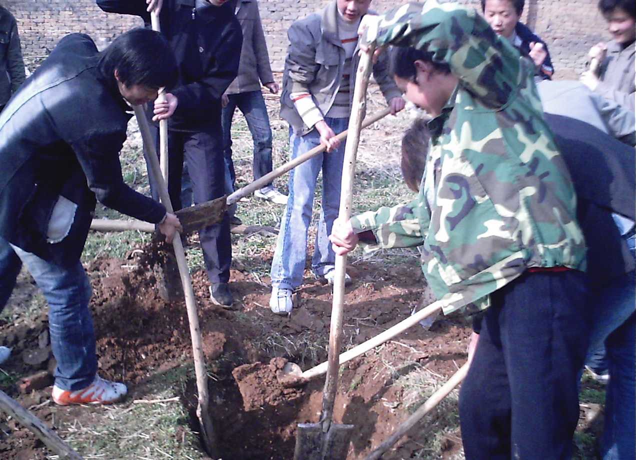 其实干起来也不费功夫,你看,四、五个同学围在一起,5分钟,就挖了一个树坑,同学们刚要放树的时候,老师过来了,说:“有点浅,再往深的挖点”。于是,停下来的铁锹又忙活起来,最后,有两尺多深时,老师让同学将树放在坑里,开始栽了。