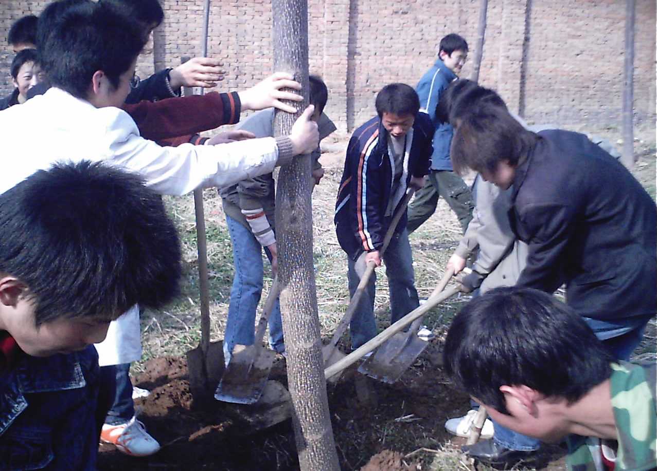 这是最大的一棵树苗,七、八个同学将它从车上卸下来,放在树坑里护着,其余同学开始埋土。同学们边干边聊,有个调皮蛋说:“记下我们栽的这棵树,等将来我的孩子在这里读书时,我要告诉他”。逗得大家哈哈大笑。