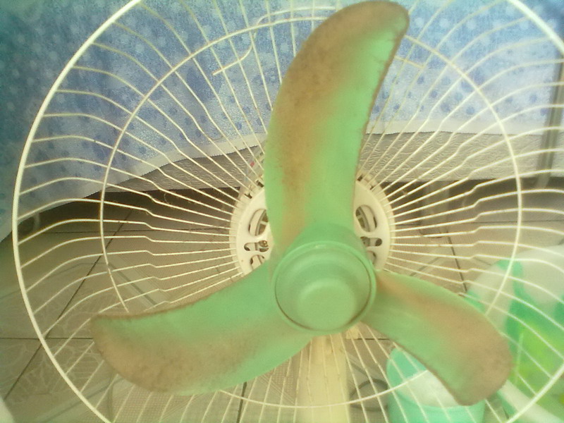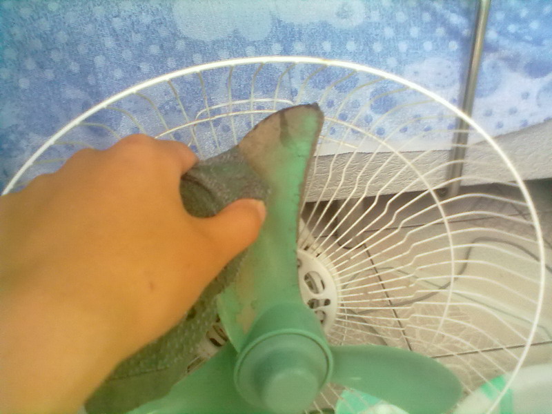 我拿起浸了洗衣水的抹布,一手按着风扇底座,一手拿着抹布用力地擦洗风扇各处的污垢,不论是灰尘还是头发丝我全都擦了下来,看其中两片扇叶已被我洗净,就剩下最后一个了。