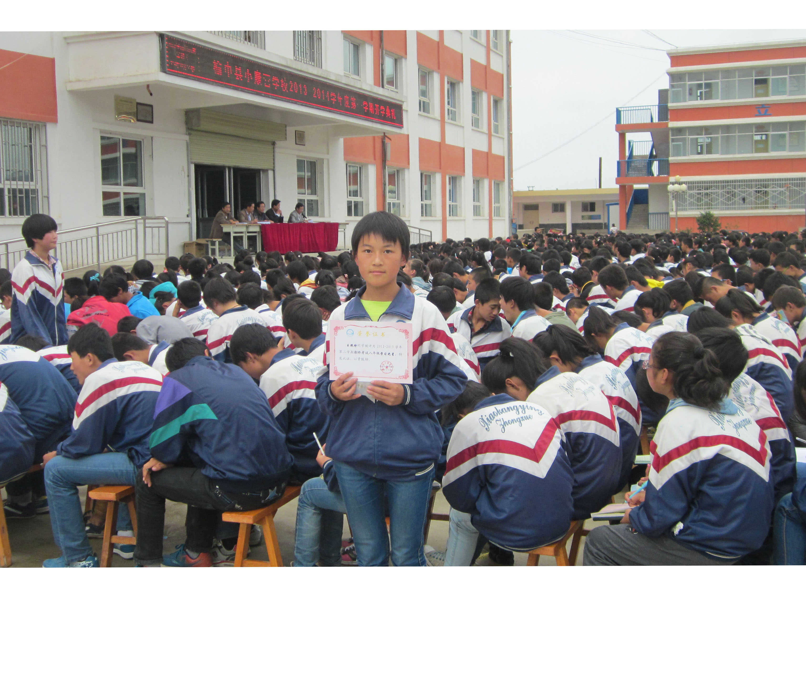 在开学第二周,星期三下午第一节课下以后伴随着庄严的音乐,同学们秩序井然地集合到各班的区域里,准备迎接七年级新生,以及给优秀学生的鼓励。大会第一项,给优秀学生发奖,小学部可爱的小同学们发了奖以后脸上露出欣慰的笑容。