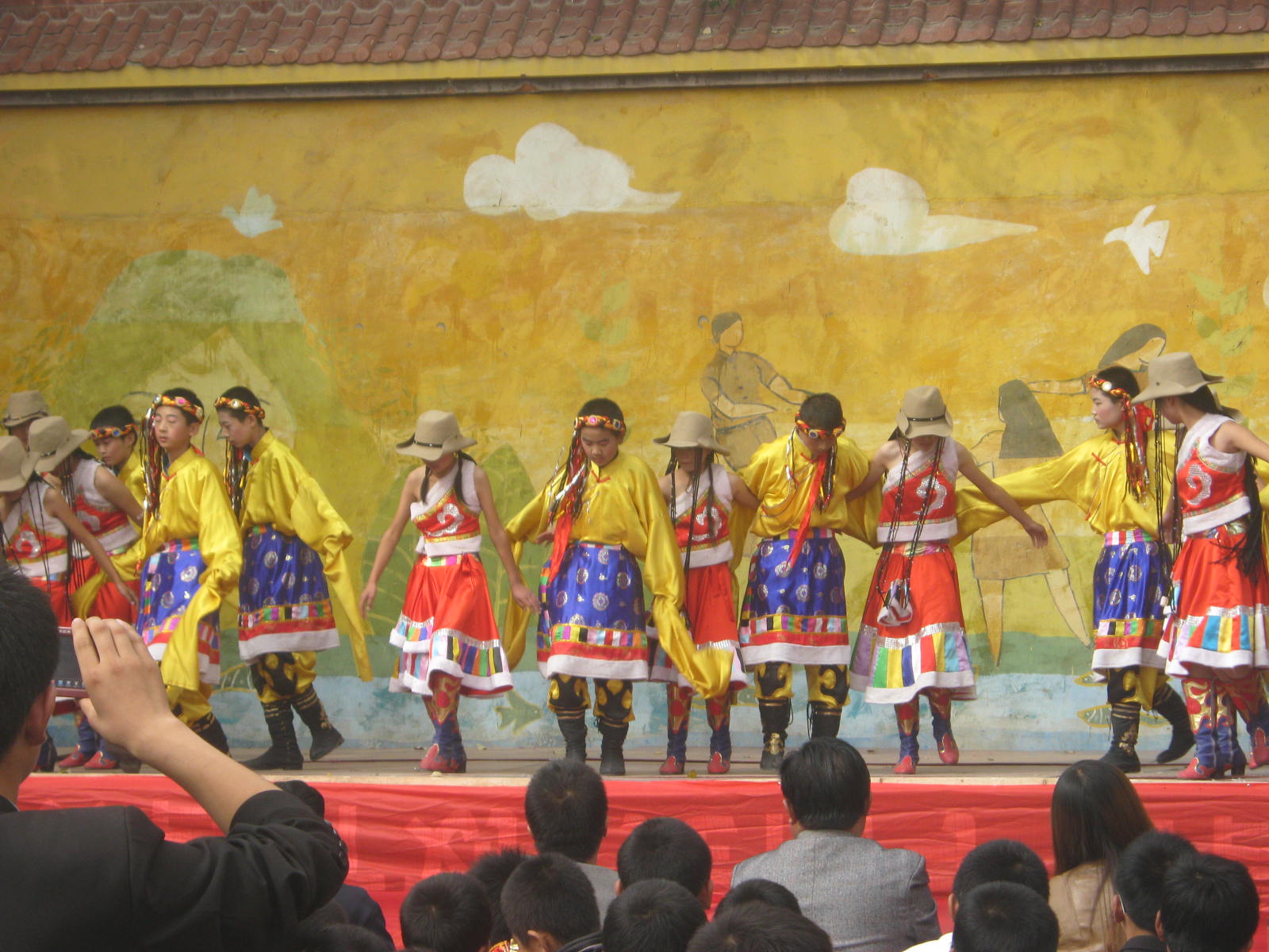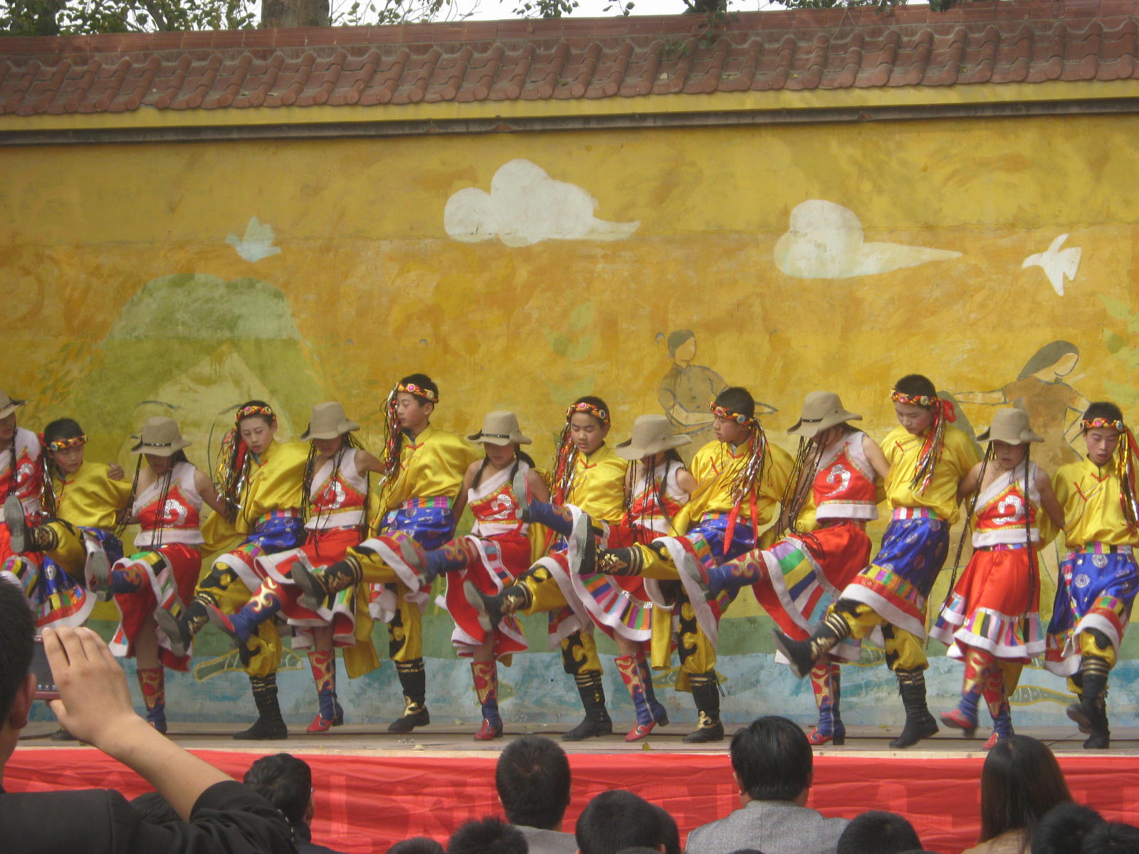 表演前一天,我们的服装到了,同学们摸摸这个,瞅瞅那个,藏族人的衣服穿时真麻烦,头饰、靴子、衣服、腰带……好不容易穿好衣服后,我们高兴的跳舞,那天我们过的很愉快!第二天,我们舞蹈表演的很成功,可是小品有几个部分差点忘词,下台后,我们的心理很忐忑,当我们听到10分时,我们激动的流下了眼泪!国庆,谢谢你为我们带来这么多磨炼与欢乐,同时,也祝福新中国母亲更加繁荣昌盛!