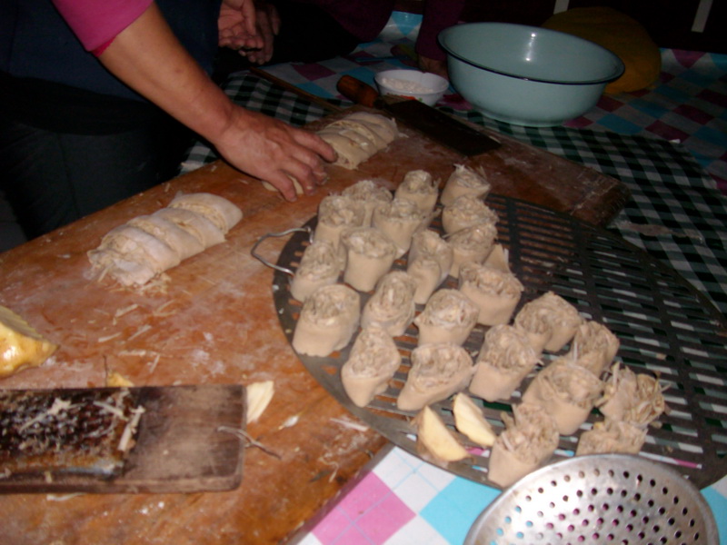 擀好皮后,把洗净的山药插成细丝,均匀地撒在面皮上,一层一层地卷成整团,然后上刀切成段。切这一步很重要,不能用手摁着切,防止皮和丝粘在一起;切的既要快又要准,才能使顿顿鼓鼓的、大小还适中。再轻轻地捏住两端抖松了放在蒸笼上等待入锅。一个个莜面顿顿站立着,憨态可掬,朴实无华!