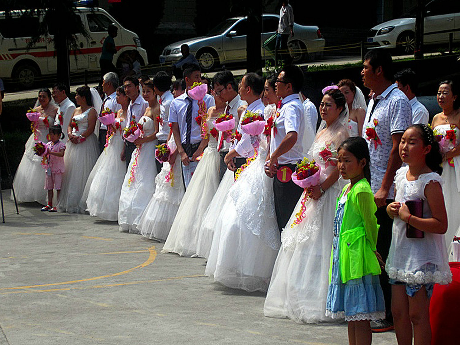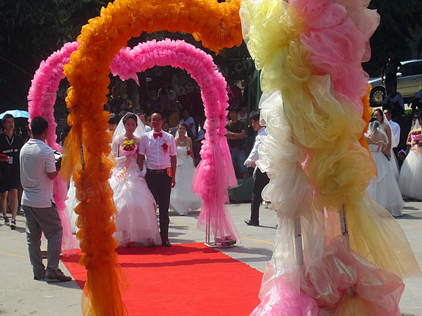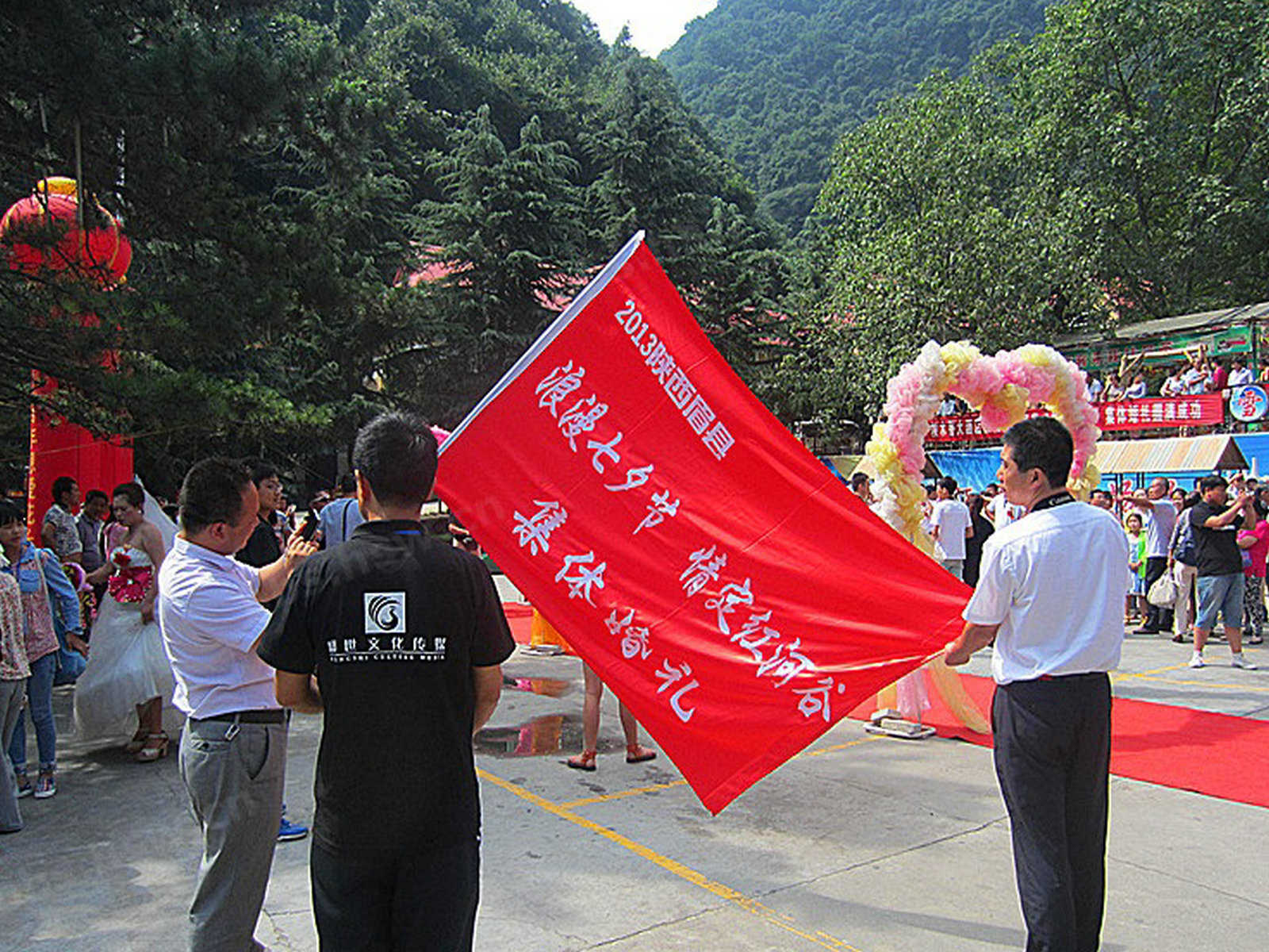 书上记载,在晴朗的夏秋之夜,天上繁星闪耀,一道白茫茫的银河横贯南北,银河的东西两岸,各有一颗闪亮的星星,隔河相望,遥遥相对,那就是牵牛星和织女星。七夕坐看牵牛织女星,是民间的习俗,相传,在每年的这个夜晚,是天上织女与牛郎在鹊桥相会之时。织女是一个美丽聪明、心灵手巧的仙女,凡间的妇女便在这一天晚上向她乞求智慧和巧艺,也少不了向她求赐美满姻缘,所以七月初七也被称为乞巧节。人们传说在七夕的夜晚,抬头可以看到牛郎织女在银河相会,在葡萄架下可偷听到两人在天上相会时的脉脉私语。这是眉县第二届集体婚礼,共有二十对男女参加。