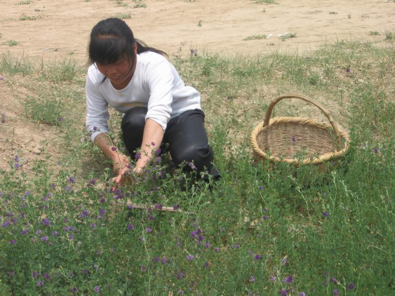 秋天是凉爽的。女孩们几个一群背着背登,手持镰刀在山上割草。她们来到山坡上,把背登放在一旁,右手持着镰刀割,左手抓住草,等把草割上了就往背登里放。