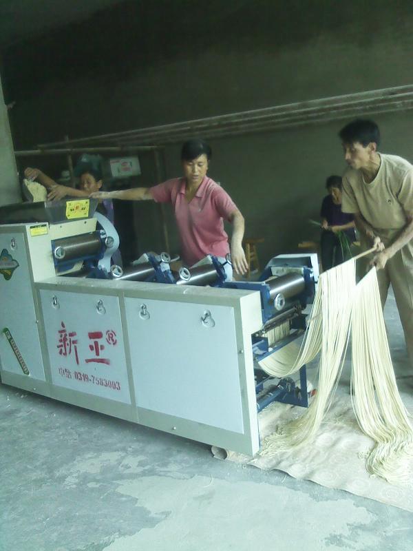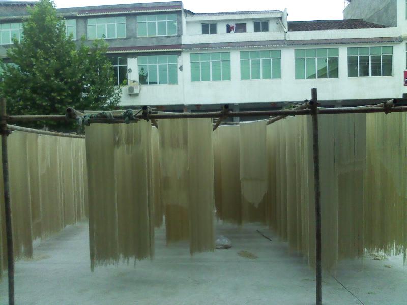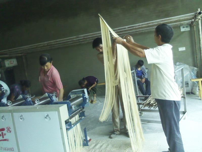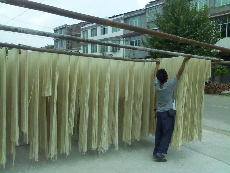 将白面搅拌好之后就需要借助于专门的机器。将白面紧紧的压在一起,然后反复几次之后就压成了1毫米左右的白面片,这时面条的基本雏形就出来了,再根据自己的爱好选择不同的形状,有"宽刀"窄刀"之分。架好刀架就是最后一步了,细长的面条慢悠悠的从刀架中吐了出来。然后将面条放到太阳下暴晒几个小时就成了我们平时吃的面条了。这次我着实张见识了。