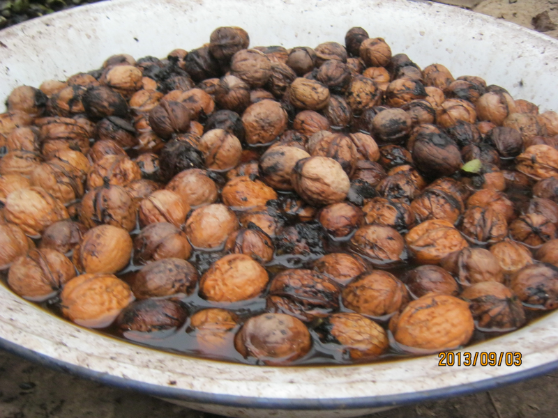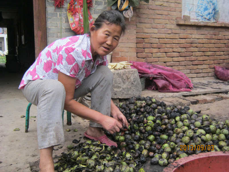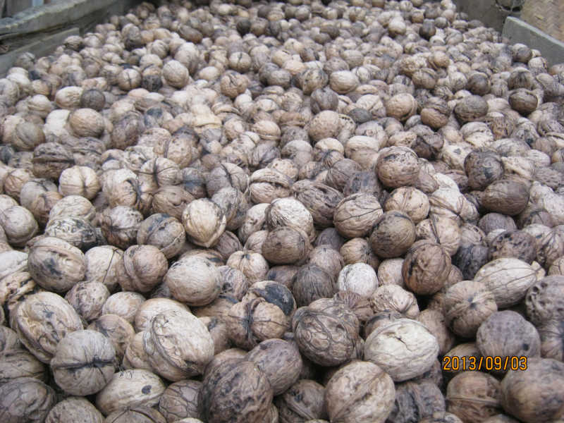 核桃剥好后,就要在这个大铁盆里清洗了。先将剥好的核桃扔进盆里搅拌着洗。在这样的铁盆里洗核桃,需要换水再洗一次才能洗干净。等到核桃洗干净后,就可以拿去晒干了。