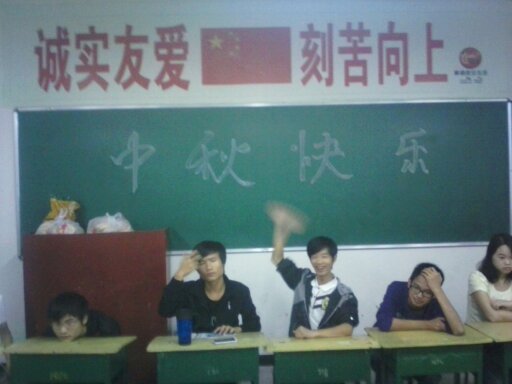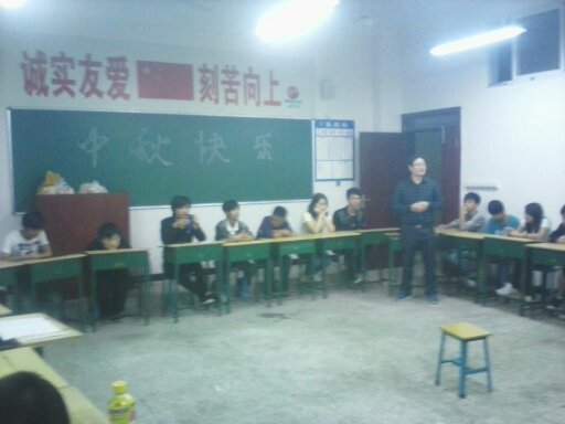 看,他们在干什么?告诉你吧!他们在欢呼。今天是中秋节,看到了么,讲台上是我们买的月饼。其实我刚到教室门口,由于学习的紧张,我忘了今天是什么日子,也不知道他们在欢呼什么,但是当我进到教室,看到黑板上斗大几个大字,才猛然之间记得,今天是中秋,我们中国人民共同的节日,看我这糊涂的,这么重要的日子,居然忘掉了,真是不好意思。