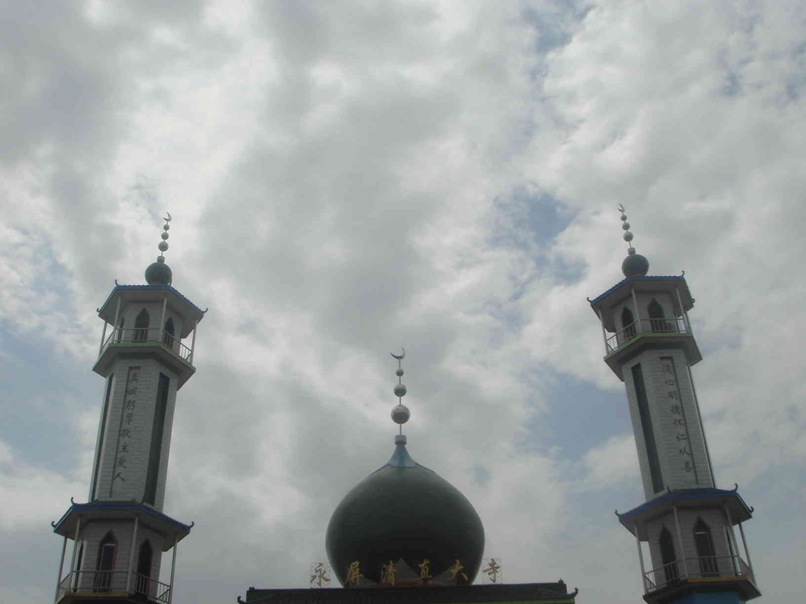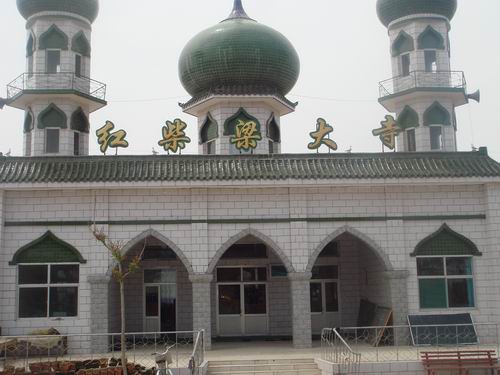 看,我们神圣的清真寺的谷包显得多么古朴高雅、颇具特色。它的顶端上方建有一串"宝瓶"和一弯"新月",这是伊斯兰世界的共同象征。墙壁上的图案大都是以优美的古兰经文装饰,故而显得淡雅、柔和而又不失庄重。体现出浓郁的回族特色和民族特色,清静幽雅的意境给清真寺增添了亮丽光彩。反映了简洁、明快、轩敞等伊斯兰文化与伊斯兰建筑的风格,主体部分多采用白色和绿色,体现着浓厚的伊斯兰教的气息,这不仅是信仰伊斯兰教的穆斯林人民聪明智慧的结晶,也是我国民族建筑艺术宝库中的宝贵财富,更是回族文化对外展示自身形象的一个重要组成部分。