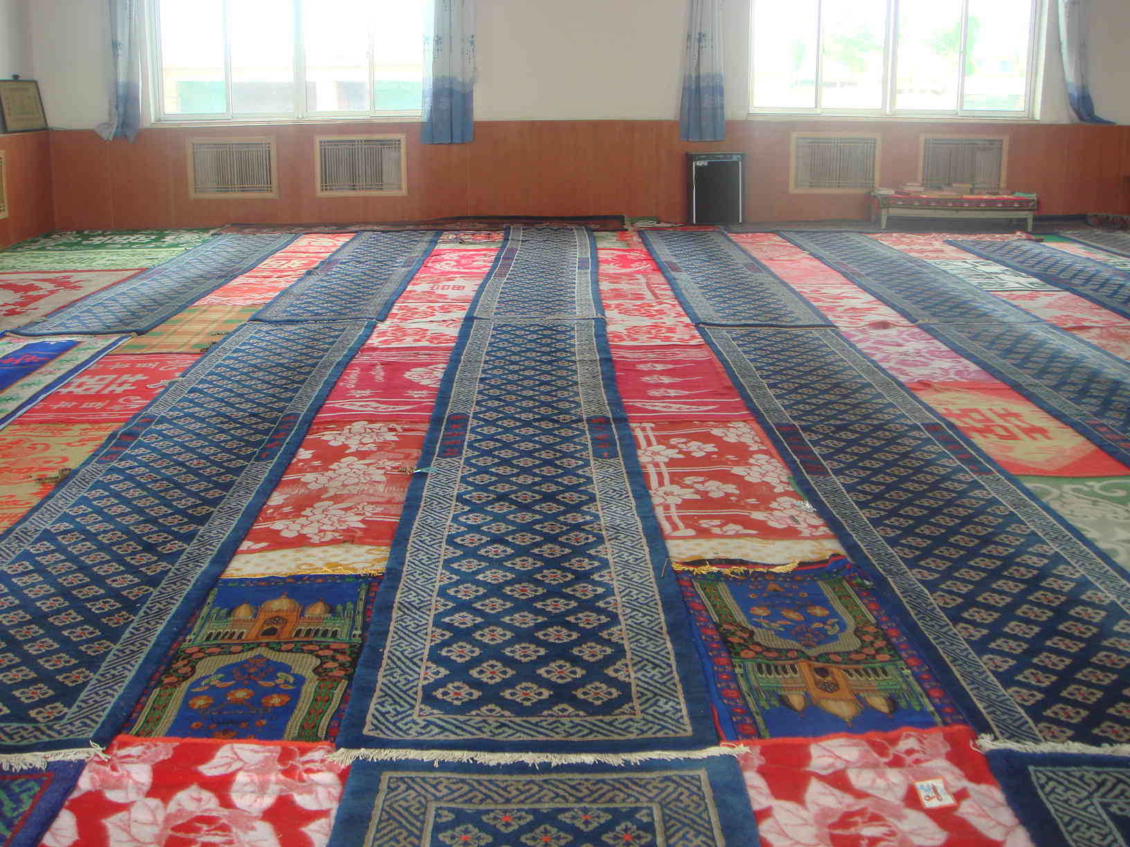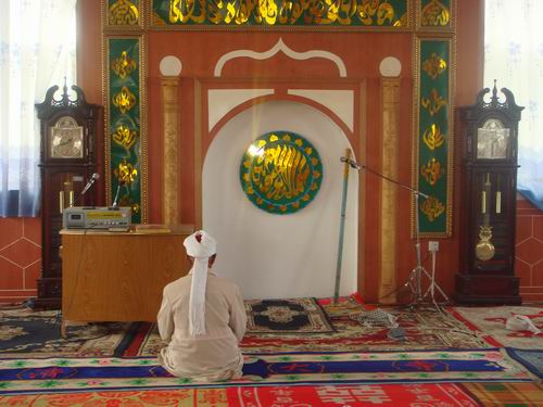 古香古色充满回族色彩的金壁前,一位阿訇头缠白沙巾,端正的跪在色彩斑斓做工精美的织锦上,看得出他是一为虔诚的穆斯林教徒这和谐的一幕画景,向我们展示了回族的神圣,圣洁与崇高。宋代陆游曾在《国中赏梅》说过"阅尽干葩百卉春,此花风味独清真" 这不就是说明我们回族清真寺的伟大与神圣吗?