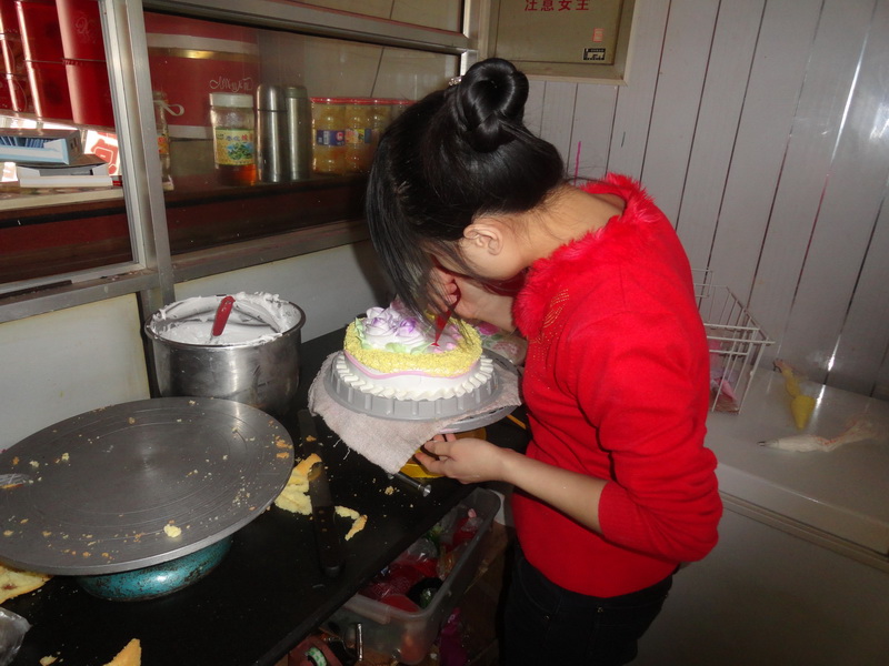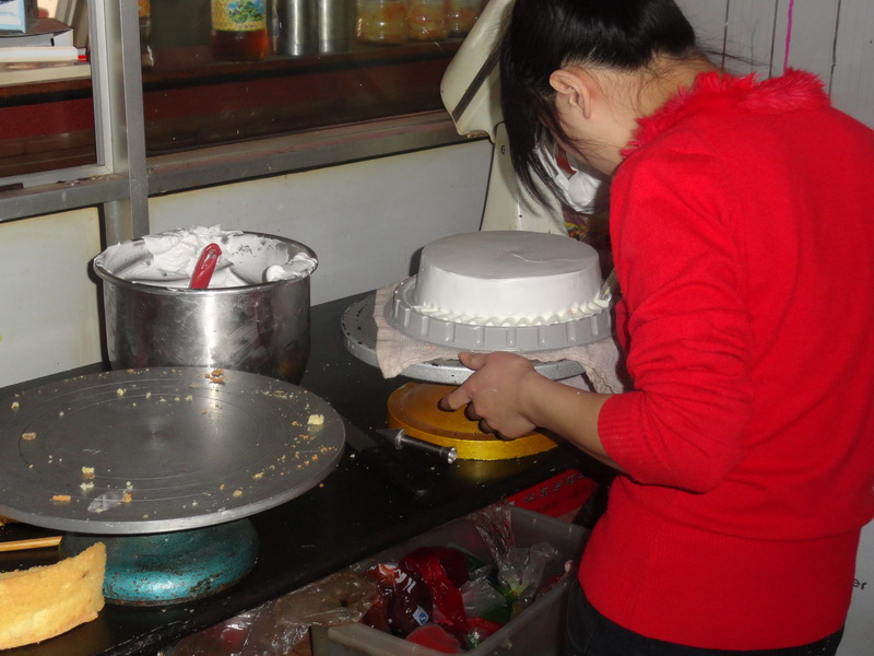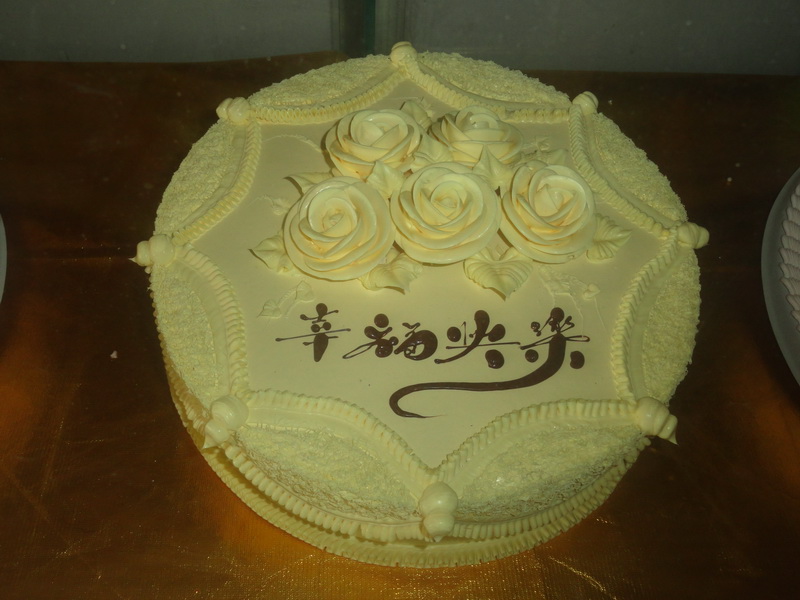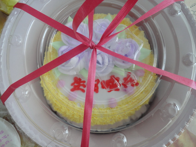 做蛋糕的阿姨拿出材料,不到十分钟就把一个蛋糕做好了。我最佩服的是她竟然能用奶油在蛋糕是画花和写字,那熟练程度一点儿也不比我用彩笔差。最后,那位阿姨还赠送了我们一包蜡烛和一些吃蛋糕的盘子。
