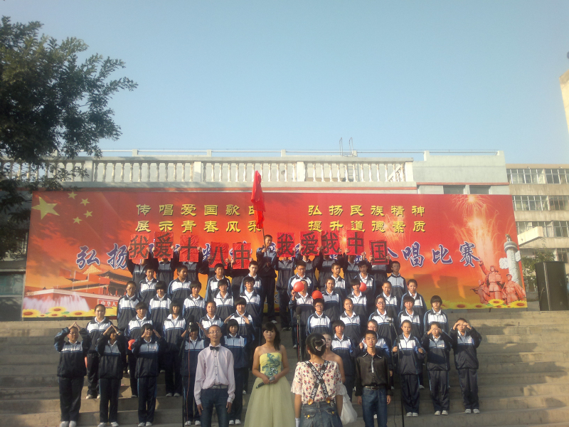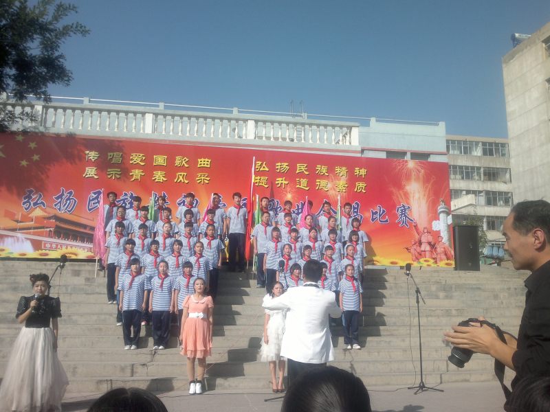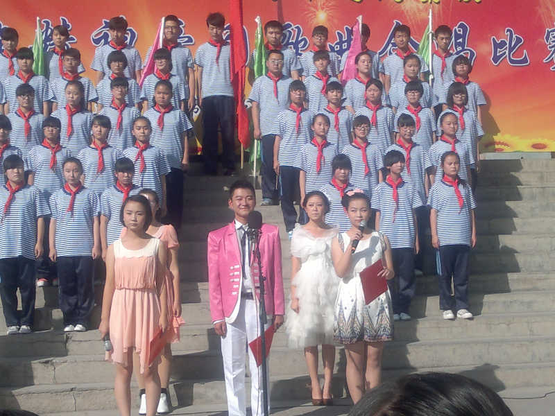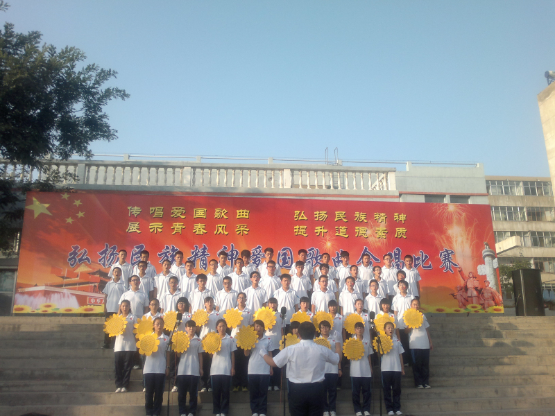 首先,待我们全部就座之后,三位主持人登台献词,激情澎湃的演说把我们的心抬到了高端,我们已经赔不及待的想要吼上两嗓子了。随着主持人的一声"弘扬民族精神爱国歌曲合唱比赛正式开始",我们就进入了热爱新中国的传唱。