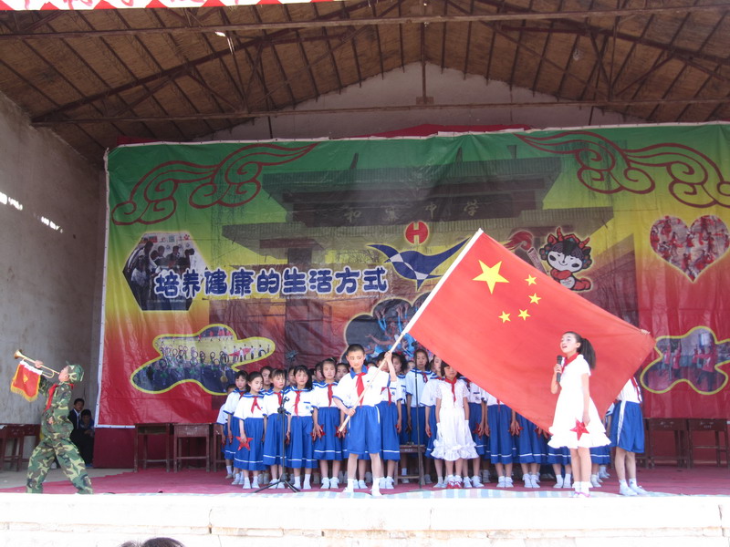 "有情九年级四班的诗朗诵---《新中国》请九年级二班的《日不落》做好准备"支持人说到。"这一点意思也没有"我旁边的一个男生无耐的说,可他到最后却大声的喊道"好---好---好"九四班的同学手中拿着自已精心制作的一个个红色木板,舞台最前有四位同学在朗诵,后面有其他同学红色木板摆出了一面鲜红的五星红旗,这面红旗表现出了他们对新中国的热爱,"新中国您是我生命,我永远爱您、、、、、、"宏亮的声音从舞台的这边响到了那边、、、、、、