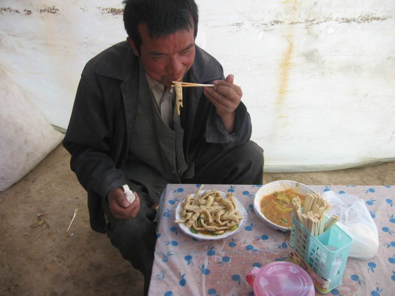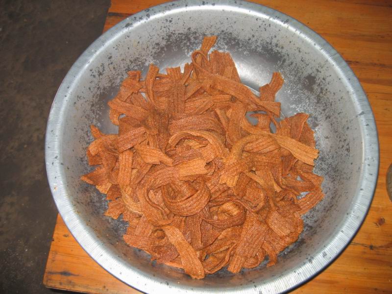 根据不同人们的口味,人们将热腾腾的牛津面拿出来和上辣子油,这样就成了麻辣条,这是最环保的绿色食品,不添加任何色素,当地人们经常为孩子们这样做。