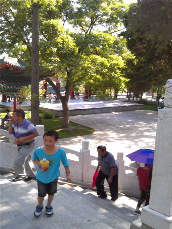 这天热的,真似一个火炉,路上的行人使出了浑身解数,让自己尽可能凉快一些。一路上,我都在不停问,我们要去哪儿,姐姐总是笑笑,然后说:"保密。"我岂能就此罢休,但姐姐这次的耐性超出了我的想象,怎么都不告诉我。 走了一会我们到了黄河边,发现那里有好多人,他们都在树下的椅子上边乘凉边闲谈。我在栏杆边看见了黄河上的船,人们在上面玩得开心极了。我很羡慕,也想上去玩,但姐姐说,这不是我们的终点站。 我有些生气,去哪都不告诉我,还不让我玩。我满腹牢骚的跟着姐姐走,我们过了中山桥,姐姐说,到了。我一看,原来是白塔山。 走过了台阶,我们就到了一个十字状,装饰典雅的长廊。人真是多,原来人们跑到这里来避凉了,真的,这里真的比大街上凉多了。