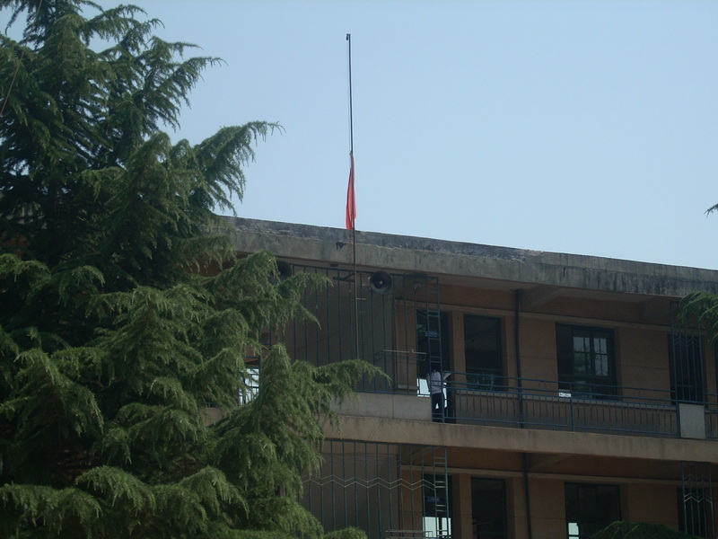 为表达全国各族人民对四川汶川大地震遇难同胞的深切哀悼,国务院决定,2008年5月19日至21日为全国哀悼日。在此期间,全国和各驻外机构下半旗志哀,停止公共娱乐活动,外交部和我国驻外使领馆设立吊唁簿。5月19日14时28分起,全国人民默哀3分钟,届时汽车、火车、舰船鸣笛,防空警报鸣响。按照这一决定,在5月19日早上,我们举行了庄严肃穆的升旗仪式,然后下半旗志哀.