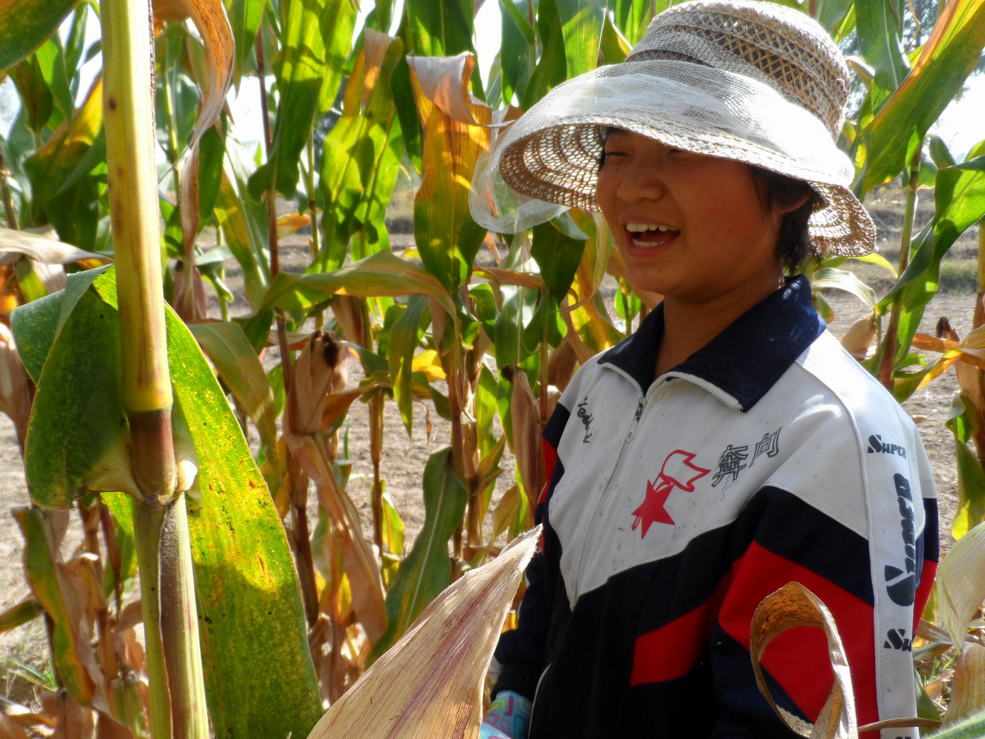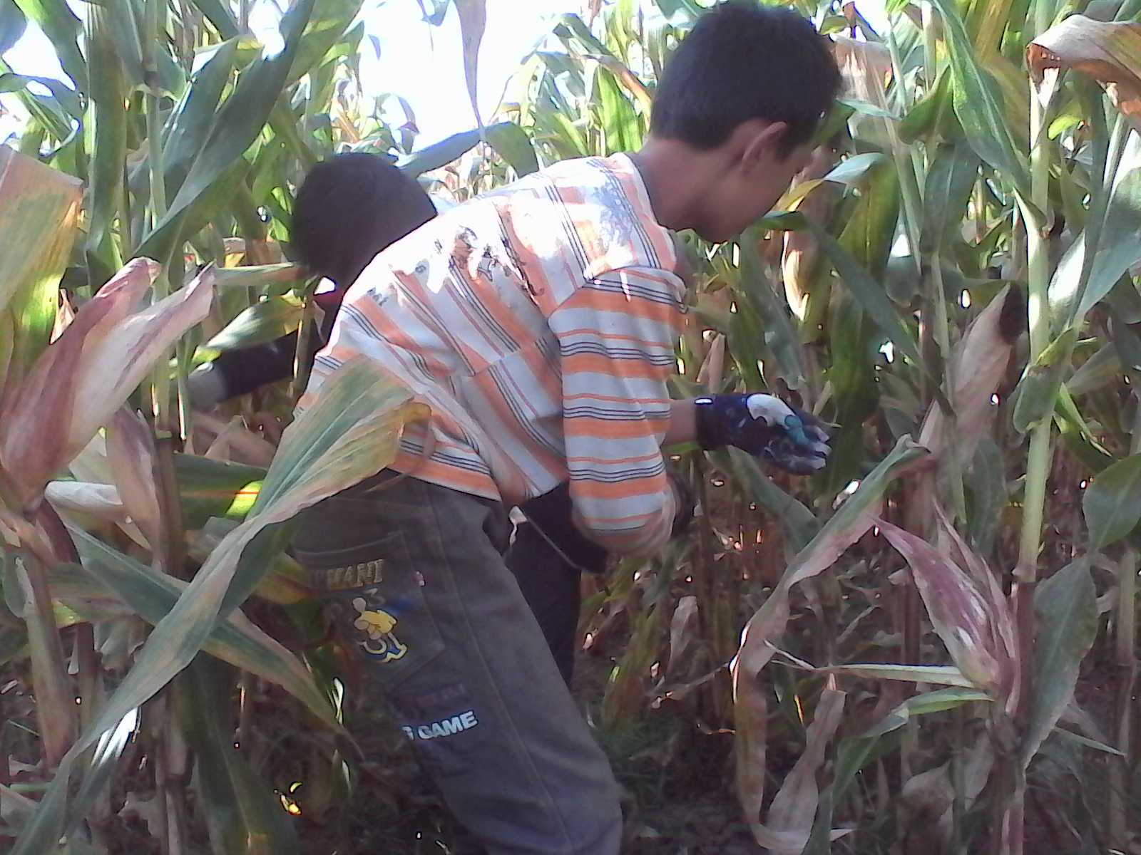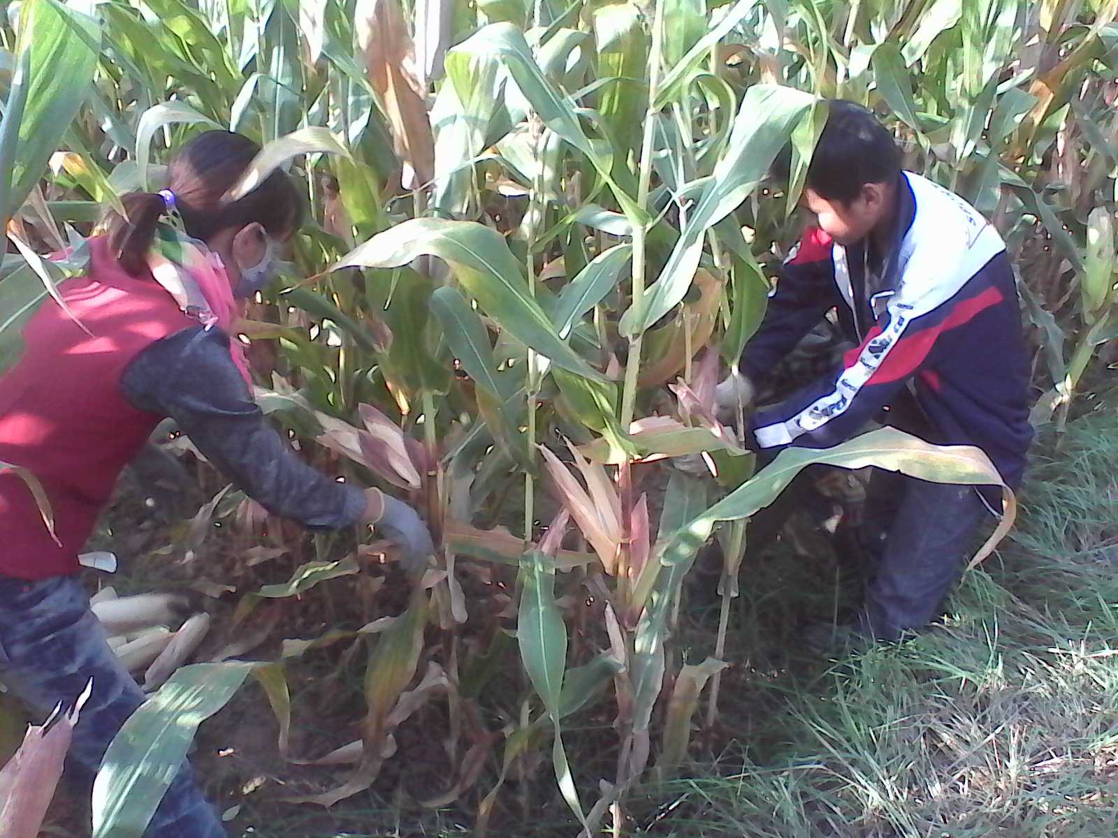 一掰玉米棒,全家总动员,老老少少都来掰。玉米棒也不能乱掰,因为它是一排一排种的,而且隔三四排就有一个大一点的间距,所以掰的时候,人站在空排里,一排一排一个一个地掰。掰玉米棒要讲究方法,才不会费劲。一只手扶住玉米杆,另一只手握住玉米棒的头,稍一用力往下拽就掰下来了,但是速度一定要快。 哪里的地种什么长得好农民都知道,所以,在这片地域,所有的地里都种满了玉米,玉米杆比人高,人进去之后四面都没有光,行行列列,列列行行,从这边进去又从那边出来,又绕到这边回来了,就像进入迷宫一样,非常刺激。