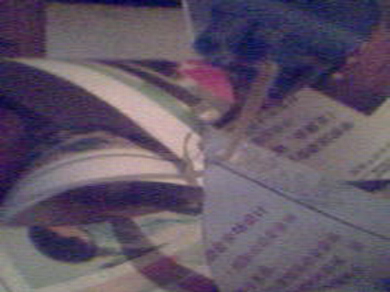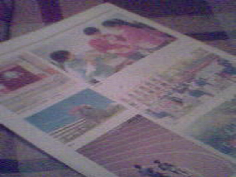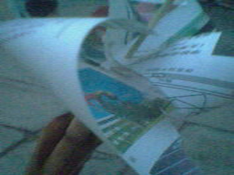 然后,你从中选取一个角穿个洞,再顺次把另外三个角用小木棒穿起来。(一定要让小风车能够灵活转动)