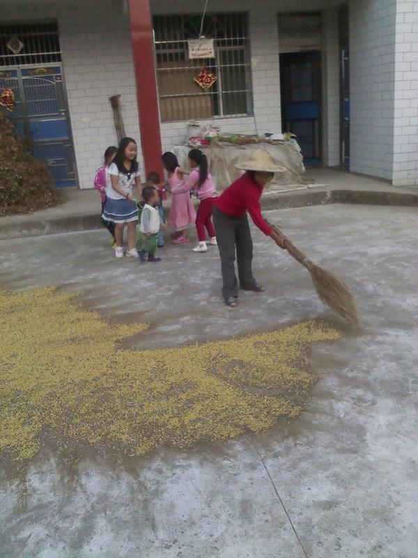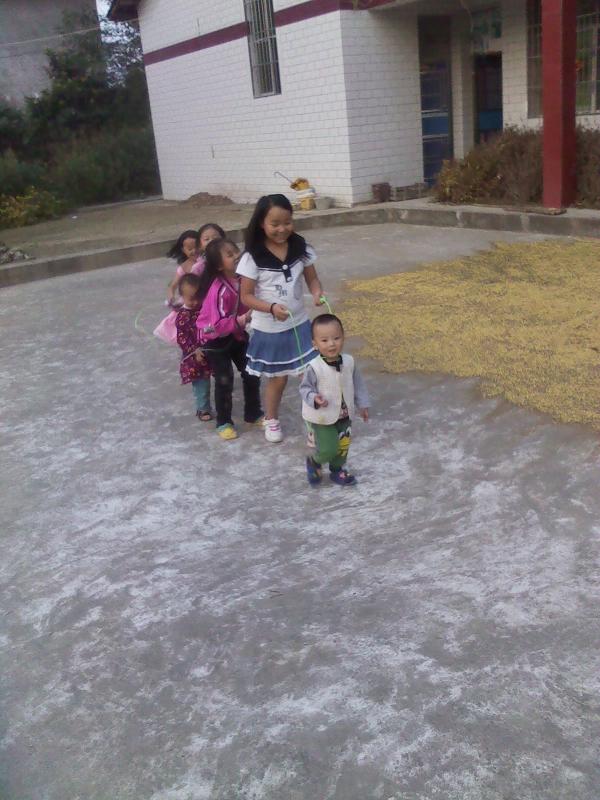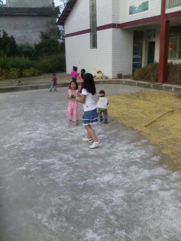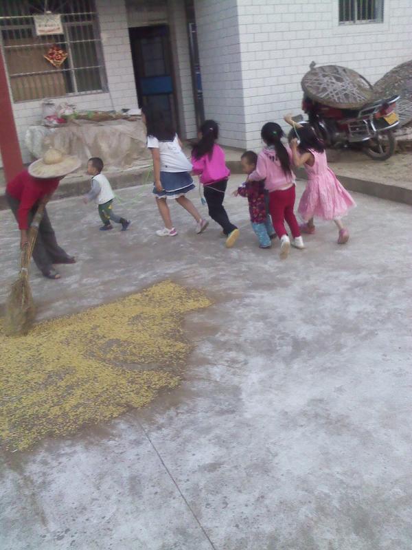 每到下午的时候就是这群小朋友们集体出动的时候。藏猫猫、警察捉小偷、跳格子、老鹰捉小鸡这些我们小时候玩腻了的游戏又被他们重复着。大人们在收晒在外面的黄豆,这群"疯孩子"们就在旁边追来追去的,而我身为"大孩子"已经不再适合这种游戏了,我只适合在一旁提醒他们不要跑到黄豆上面去玩,以免滑到。
