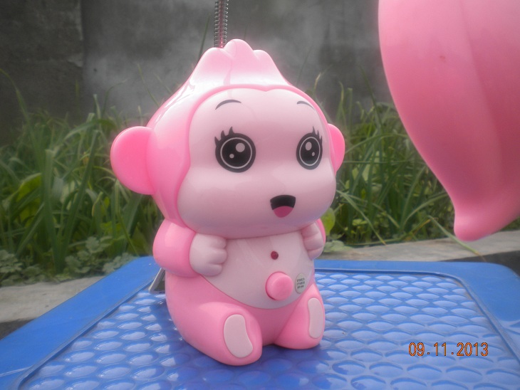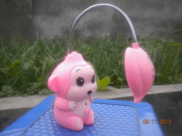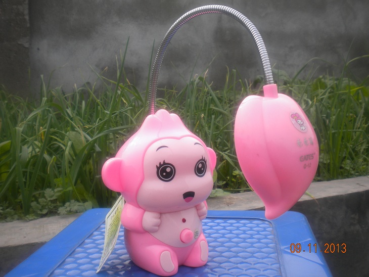 这盏灯是圣诞节的时候,妈妈给我寄回来的礼物。这盏"乖乖猴"灯是粉色的,它有一对黑黑的像月牙儿似的眉毛,一双像黑宝石一样明亮的眼睛,每只眼睛上还有三根长长的睫毛呢!它的嘴巴张着,总是一副很开心的样子。头发像座小山,头上有一根细长的可伸展弯曲的灯杆,灯杆顶端是桃子形状的灯罩,如果把灯杆弯曲,灯罩便正对着"乖乖猴"的脸,它就可以美美的照镜子了,可爱的不得了!