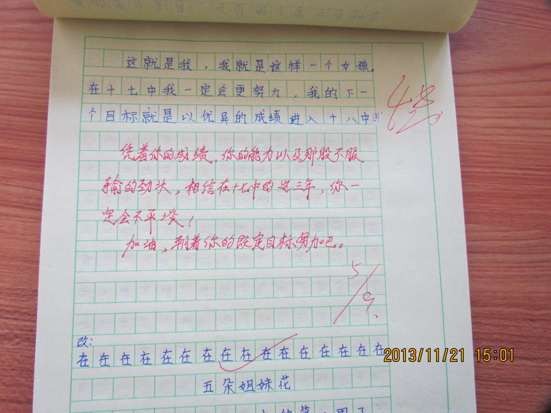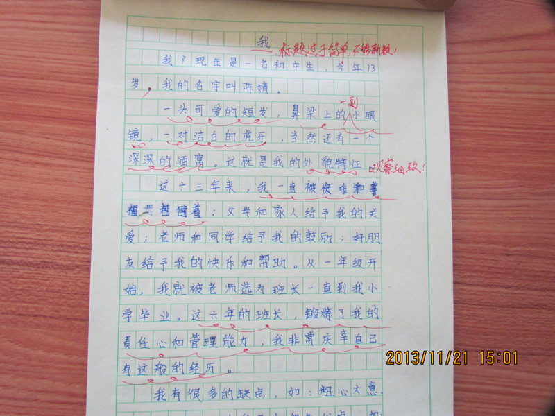 我多么渴望作文的水平能飞跃进步啊!写作文对我来说虽是一种烦恼,但也是一种磨练。我相信,只有付出努力,就会得到回报,我会进步的,写作的苦恼一定会消失在我的生活中!