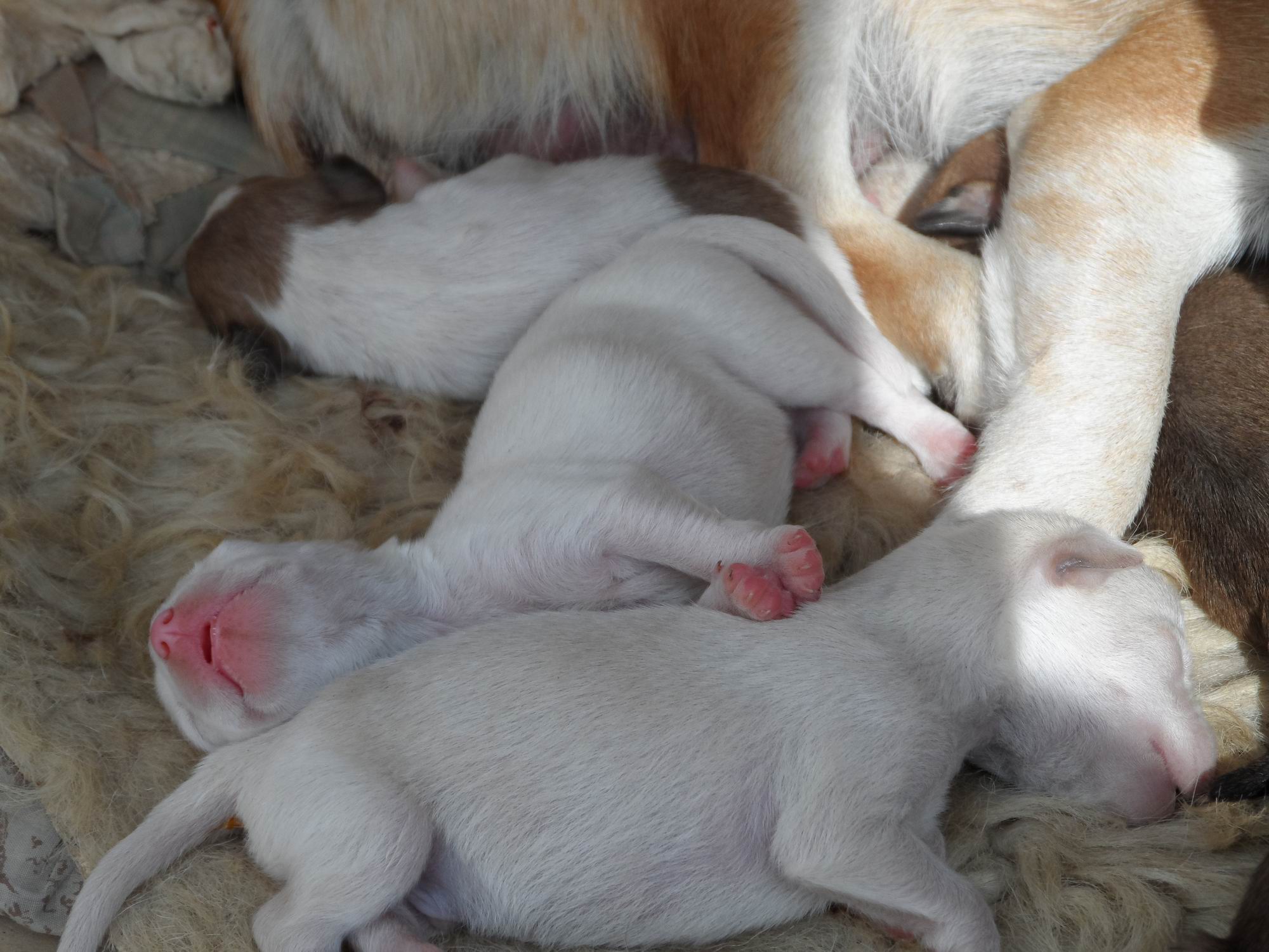 现在有四只小狗了,他们都稍稍大了一点,但眼睛还是未睁开。天气稍微好转,院子北边阳光整日都晒着,狗狗们搬了家。它们不再住狗舍,而住在大纸箱里。狗妈妈的身体渐渐垮了,骨瘦如柴,股骨和肋骨棱角分明。我们只得减轻她的负担,将一直黑色小狗送于邻居,让他家的狗来喂养。剩下三只小狗,狗妈妈立刻感到轻松,可她数得过孩子少了,这几天她可没少找过,垫子下,沙发后,墙角处。渐渐也就习惯了。