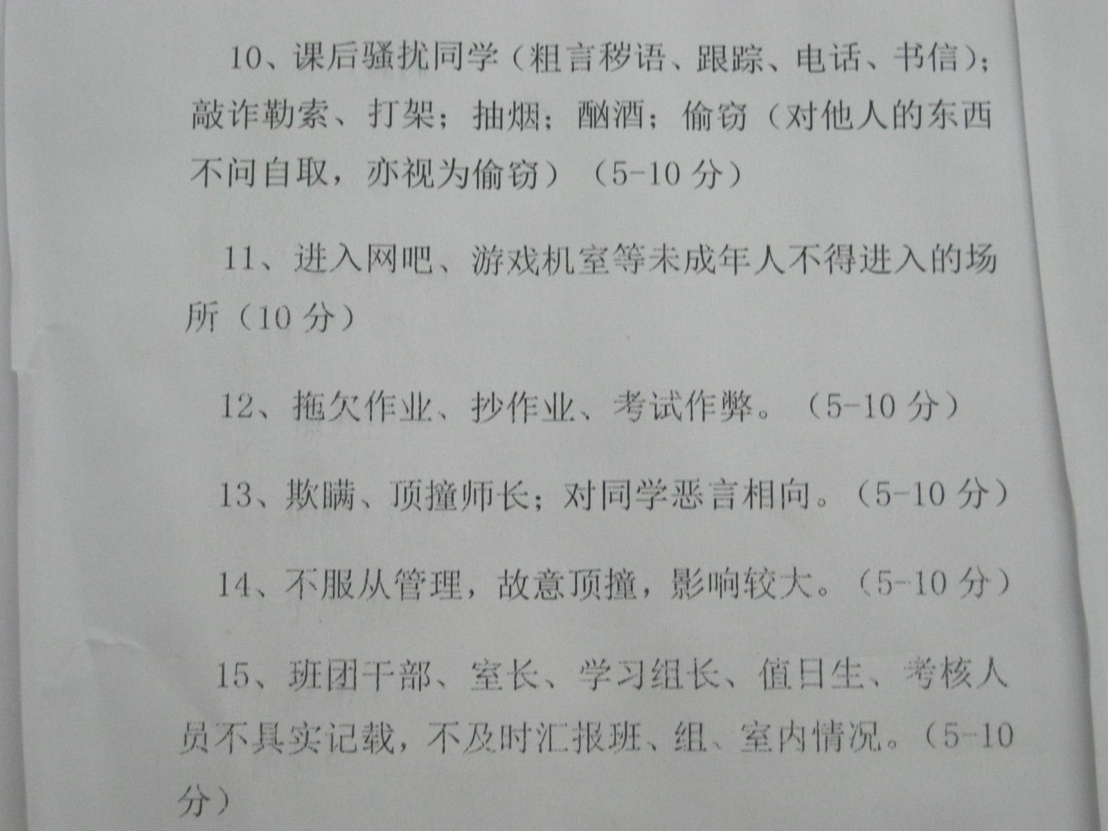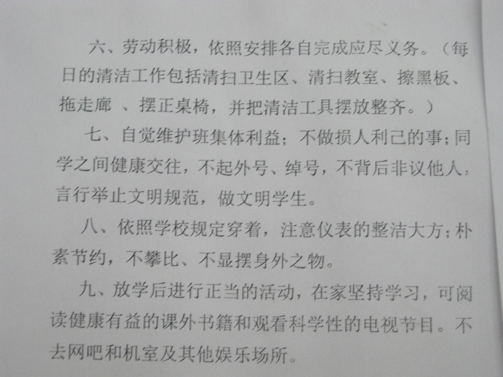 纪律方面:课间制造巨大噪音,狂奔乱跳,滋扰同学,无事生非,给他人起绰号,拿他人的特征或缺点做或说不尊重 他人的事或话,课后骚扰同学,进入网吧,游戏厅等未成年人不得进入的场所。