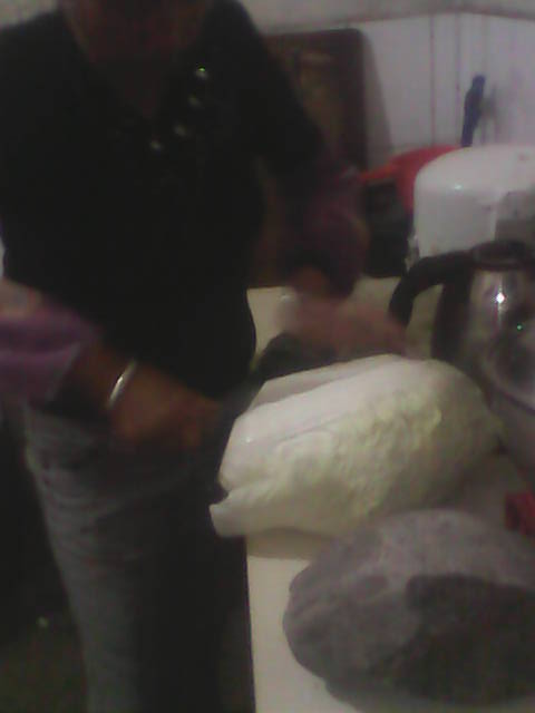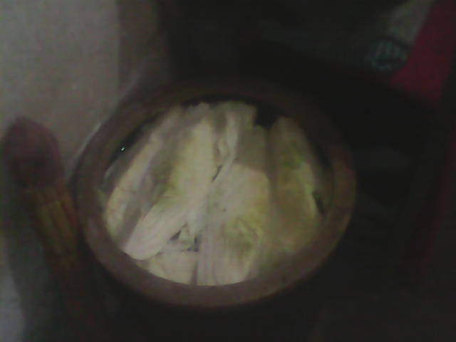 等到白菜的水控得差不多了,我们又继续开始,妈妈把每一棵大白菜用刀切成两半,妈妈再负责腌制,我和爸爸没什么可干的,就呆在一边看。只见爸爸把切好的白菜放进缸里,放一层撒一些大粒的盐和花椒,然后再放一层。我很好奇为什么要放盐和花椒,妈妈告诉我,如果不放盐,白菜就会烂掉而不会变成酸菜,而放花椒是为了让腌好的酸菜味道更好一些。