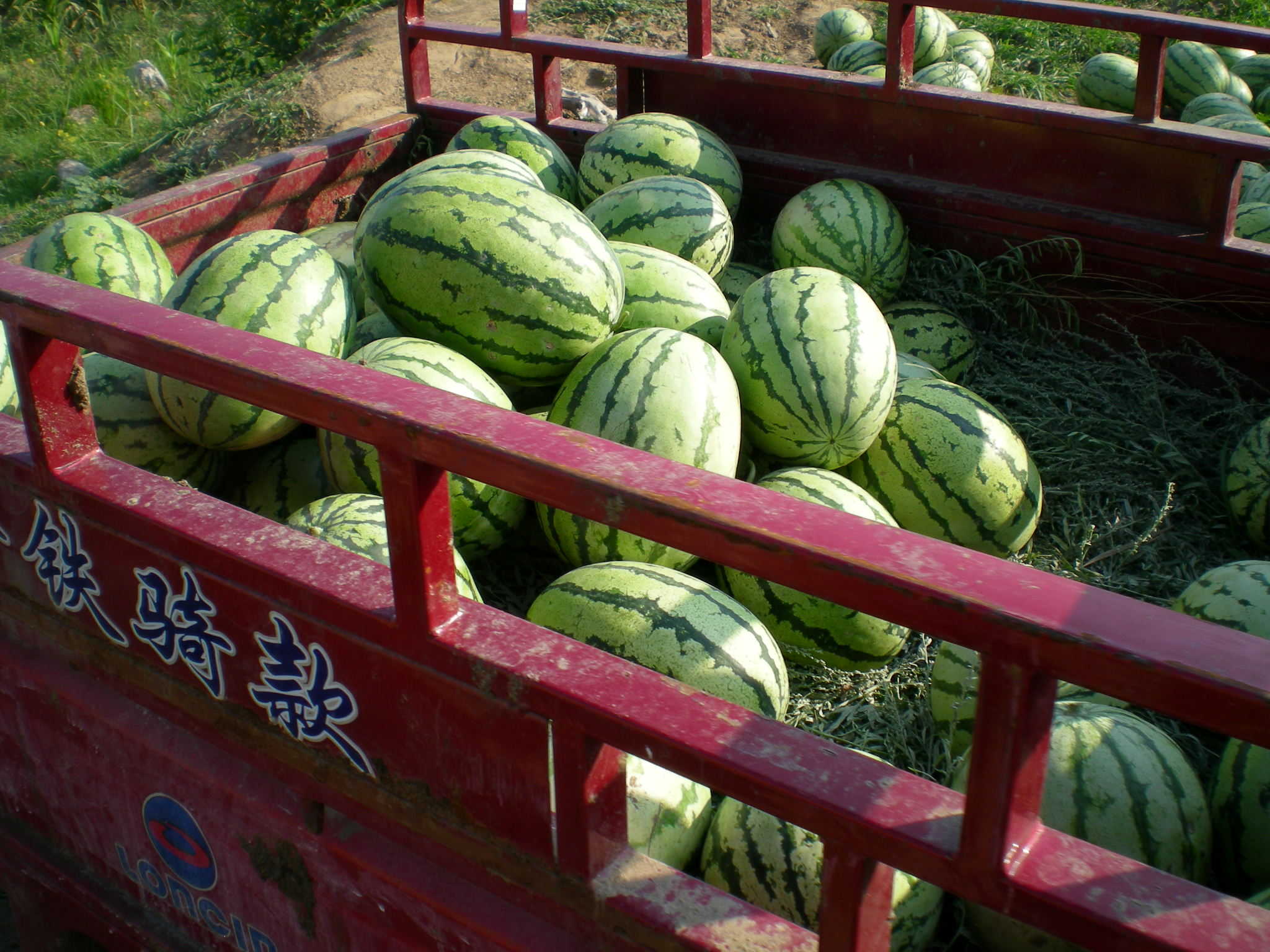 瞧,这一堆的西瓜,个个香甜可口。农民伯伯们一定在交谈今年的收成,比着自家的产量,说着丰收的喜悦。成熟的西瓜大小各异,花色基本相同,都是一条条的绿条纹。