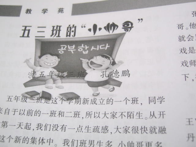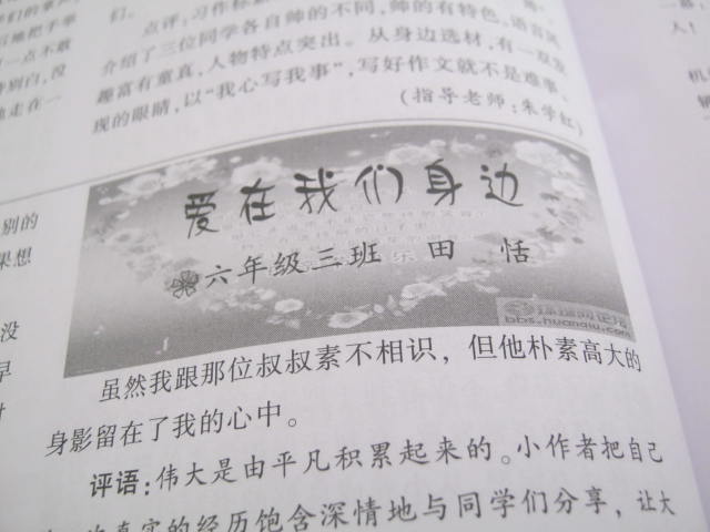 打开书的第一页,咦?这是谁呀?怎么看起来这么眼熟?哈哈,竟然是我们班的语文老师!真没想到我们语文老师有这么多荣誉。再看孔德鹏的作文,平常他总是夸别人这好那好,夸起自己来更是毫不客气,连"人见人爱,花见花开,车见车爆胎"都用上了!下面还有田恬、马玉娟、李雪春的作文,她们都不在我们班,可是我都认识她们,真为她们感到高兴。