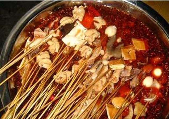 每当夜幕降临城中的街道两旁就支起了无数简易桌子。桌子中间有一个用来搁锅的大洞,锅里是用茴香、八角、干辣椒、大蒜、生姜等许多种佐料熬制而成的汤,还有用竹签串成一串一串的串串,有豆皮、土豆、海带、青菜、鱼丸……好多好吃的。