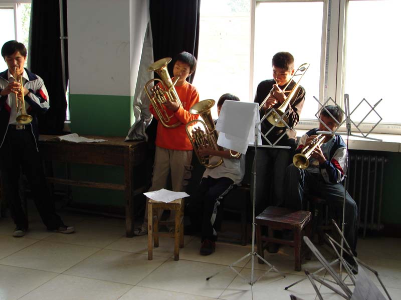 远远的就听见了杂乱的号声,走进一看,哦!原来他们正在自由练习呢。嘴吹着,手按着,眼睛在看着前面的五线谱,这样子还真滑稽。每当学校里举行较大的活动时,他们都会穿着整齐的服装,出现在全校师生面前,为学校增足了面子。